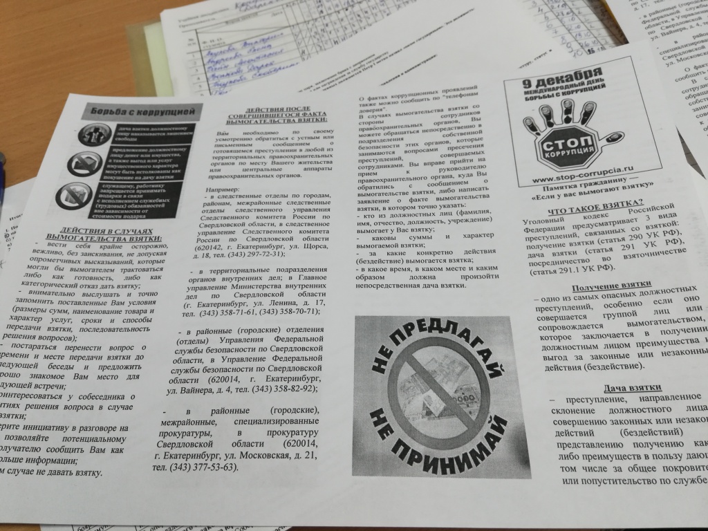 В информационных буклетах, которые подготовили сотрудники Центра профессиональной подготовки ГУ МВД по Свердловской области, подробно рассказано о том, какие действия должен предпринять гражданин после совершившегося факта вымогательства взятки, назван алгоритм действий и указаны телефоны и контакты, по которым нужно обратиться.