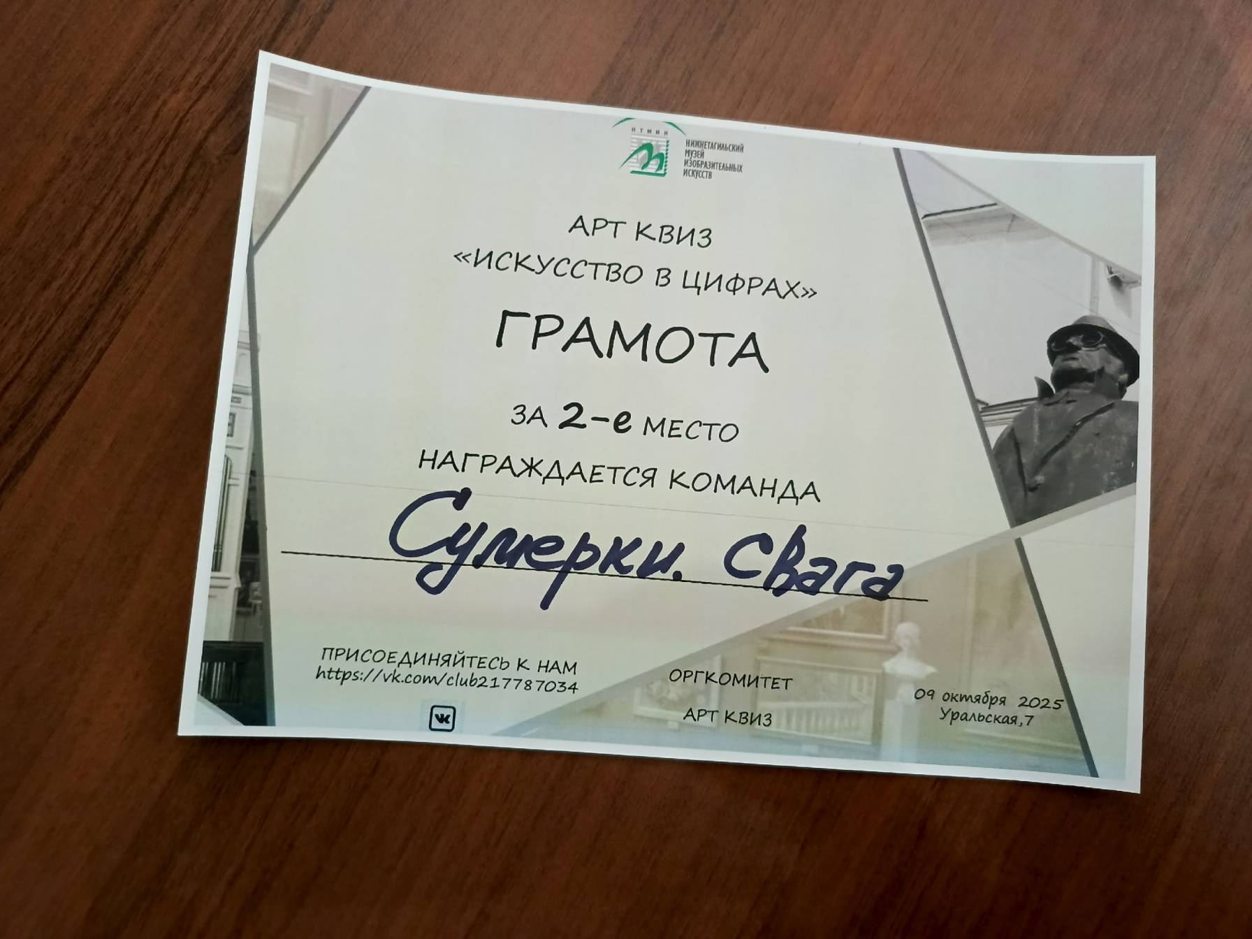 9 октября в Нижнетагильском музее изобразительных искусств прошел арт-квиз под названием «Искусство в цифрах». Участие в нем приняли девять команд, среди которых сразу три – от социально-гуманитарного факультета: «Сумерки. Свага», «Цари Берендеи», «НУИНУ».