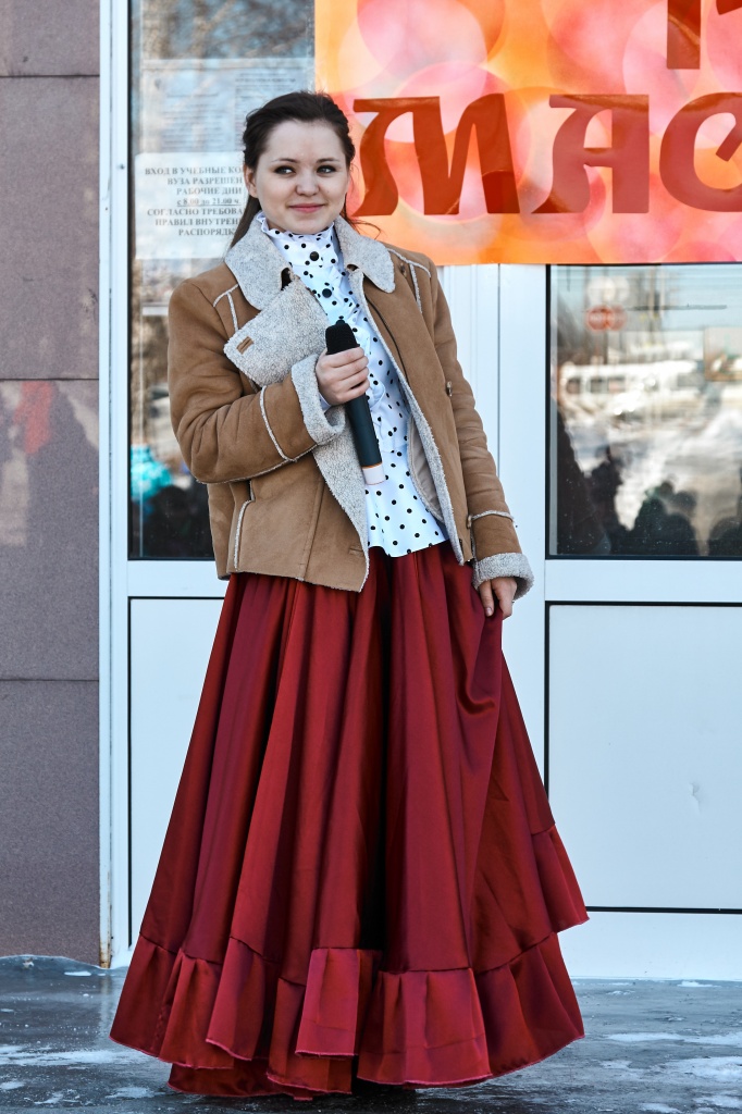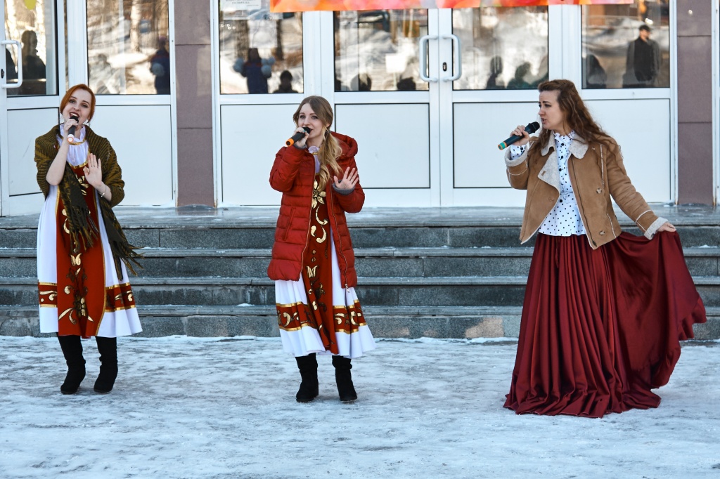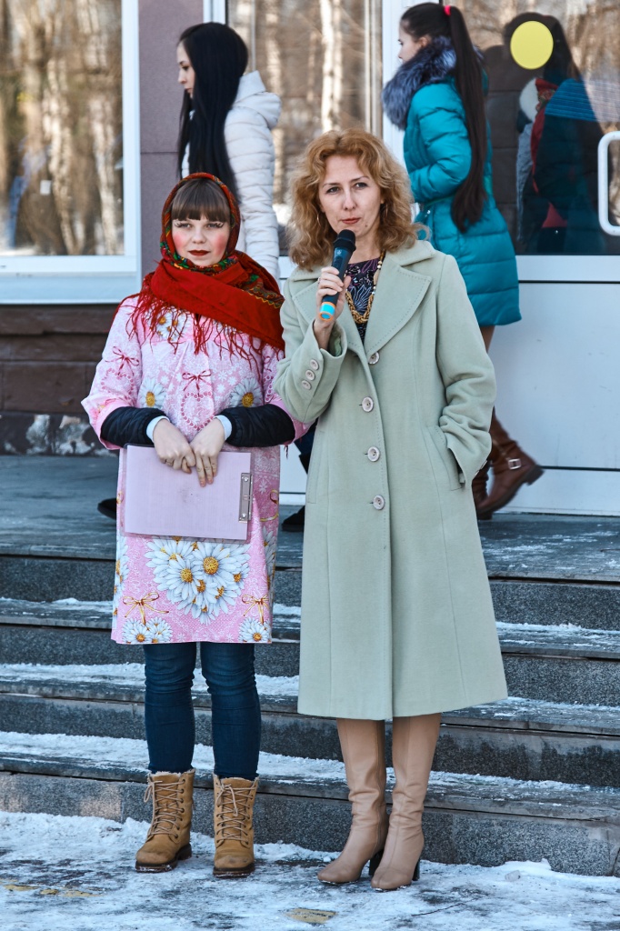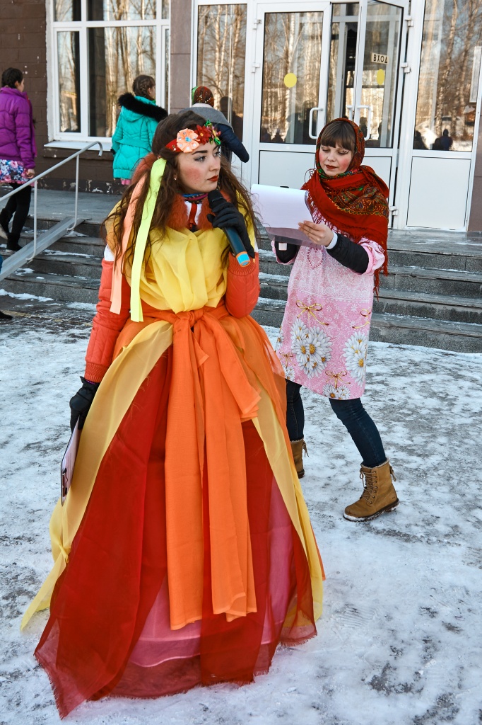 Весёлые скоморохи Михаил Жигарев и Александр Аксёнов во главе с Матрёшкой – Екатериной Чекмарёвой поднимали всем настроение шутками, да прибаутками, да Масленицу-красавицу зазывали, пришла Масленица – Алёна Неустроева да пожелала всем красного солнышка.