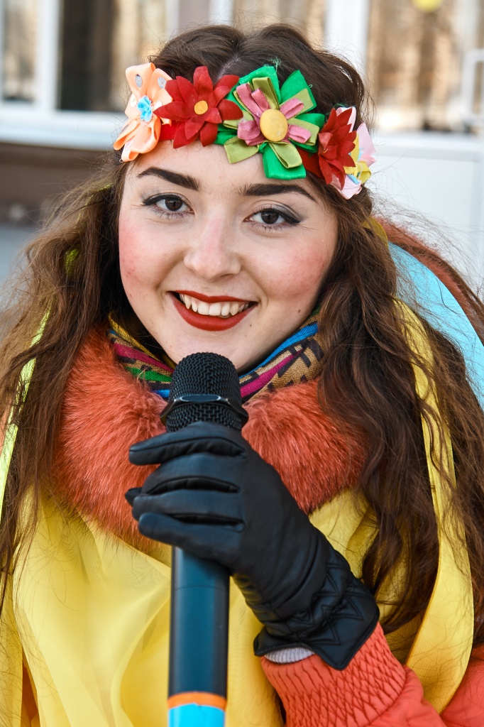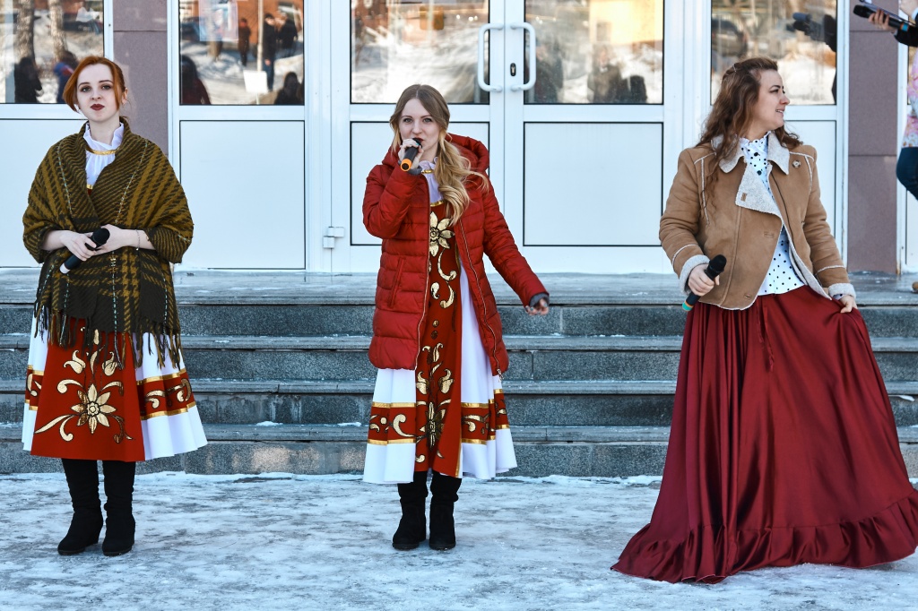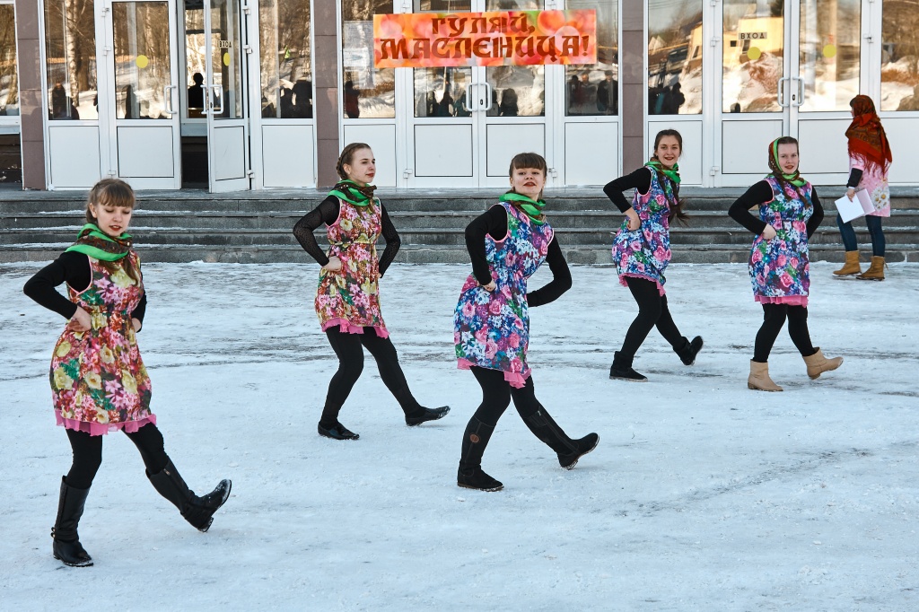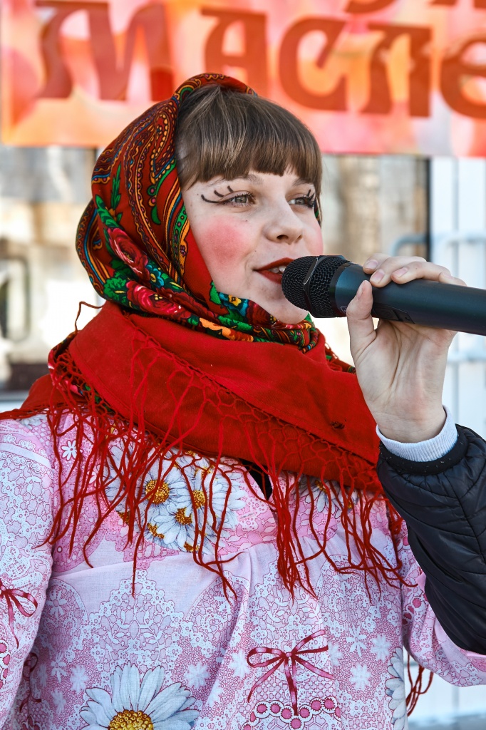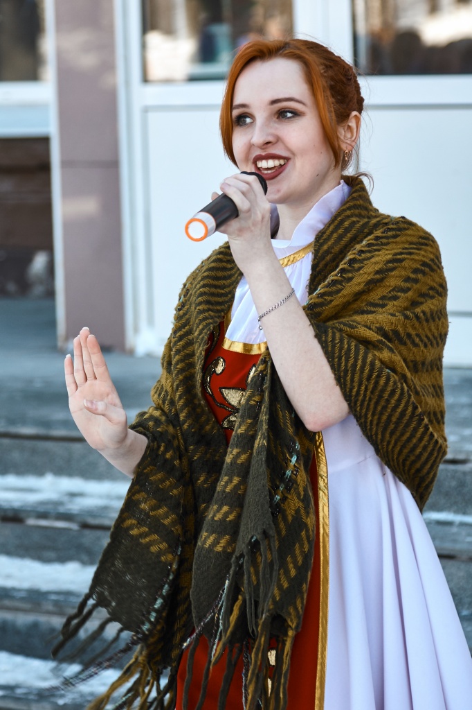 Весёлые скоморохи Михаил Жигарев и Александр Аксёнов во главе с Матрёшкой – Екатериной Чекмарёвой поднимали всем настроение шутками, да прибаутками, да Масленицу-красавицу зазывали, пришла Масленица – Алёна Неустроева да пожелала всем красного солнышка.