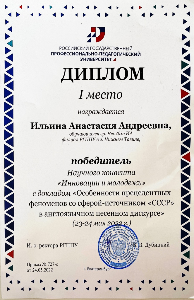 3. Ильина Анастасия Андреевна, гр. Нт-403о ИА, ФФМК. Название доклада: «Особенности прецедентных феноменов со сферой-источником „СССР” в англоязычном песенном дискурсе».