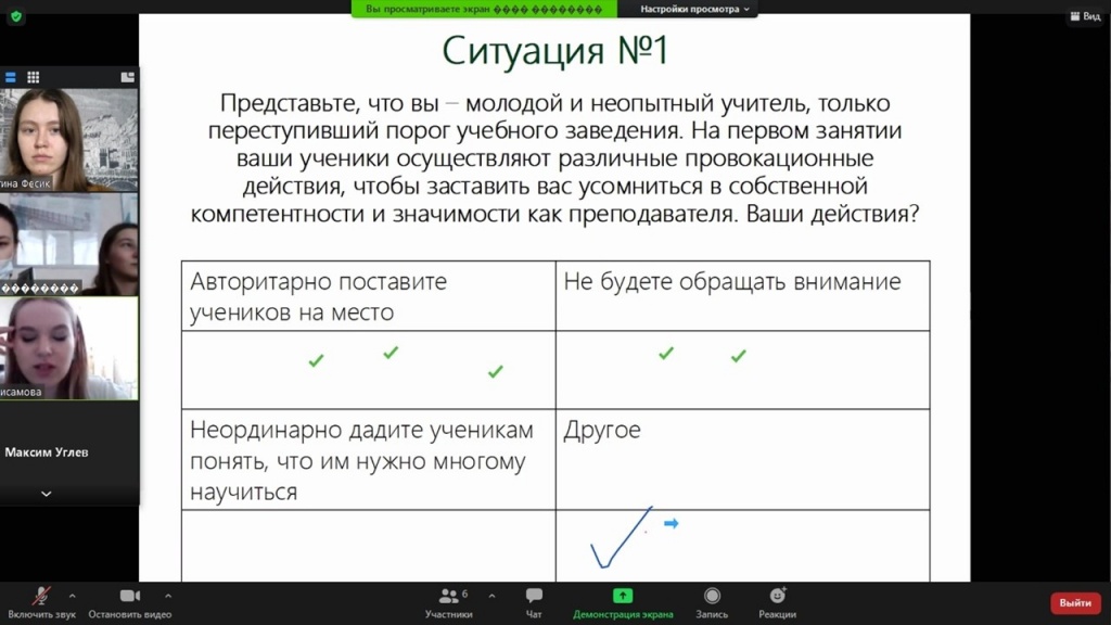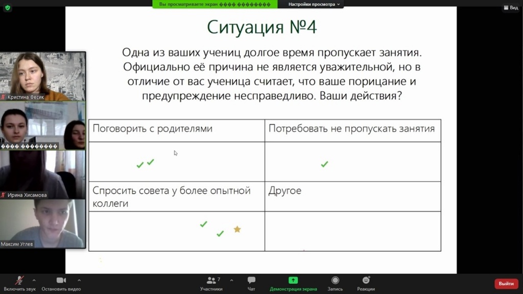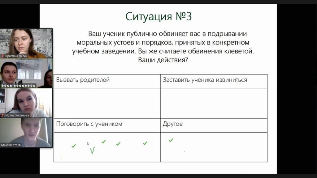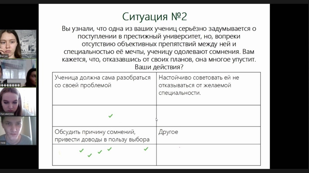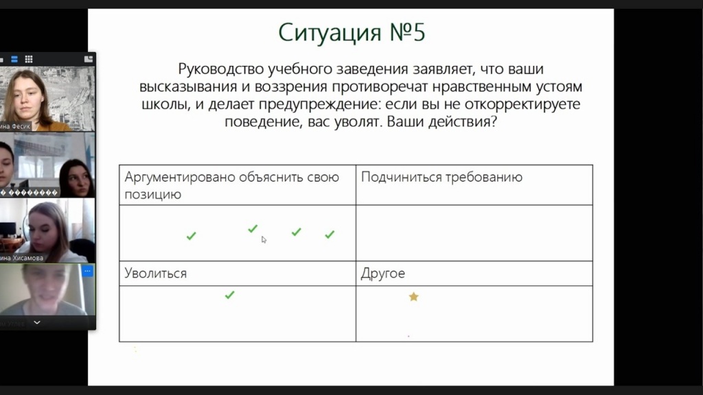 В ходе занятия мы рассмотрели пять педагогических ситуаций, основанных, как обычно, на сюжетной линии фильма. Выбирая то или иное решение, участники выявили положительные и отрицательные его последствия. В данном случае важно было учесть, что педагогические кейсы погружены в иную социокультурную среду. В эпоху исторических трансформаций особенно важно понимать, что мнение учителя по тому или иному вопросу может иметь сильное воздействие на учеников. Учителю стоит об этом не забывать. В ходе дискуссии было обозначено влияние гендерных стереотипов в профессиональной сфере, которые сохраняются и в современном обществе.