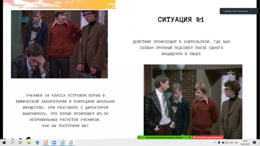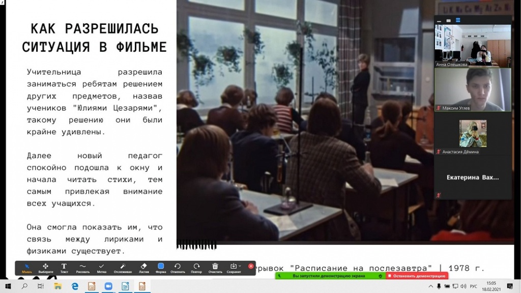 Педагогические ситуации, которые анализировали студенты СГФ, так или иначе были связаны с активной деятельностью учеников физико-математической школы: выборами президента научного сообщества, инцидентом в химической лаборатории, спором о важности поэзии на уроке литературы. Поскольку в фильме представлена идеализированная школа, учителя показаны в ней как мудрые наставники, которые разрешают все спорные ситуации с учетом мнения учеников. Однако такая гармония между субъектами педагогического процесса – это не только художественная реальность. В ходе обсуждения кинокартины студенты отметили важность личностно-ориентированного подхода в педагогике, который способствует формированию гражданской позиции, самостоятельности мышления и прививает чувство ответственности за свои поступки.