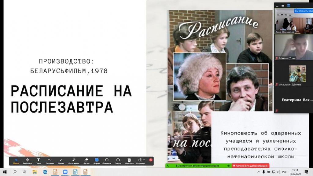 18 февраля студенты социально-гуманитарного факультета обсудили киноповесть об одаренных учащихся и увлеченных преподавателях физико-математической школы «Расписание на послезавтра». Фильм поставлен на киностудии «Беларусьфильм» в 1978 г., а актеры фильма – будущие ученые и кандидаты физико-математических наук.