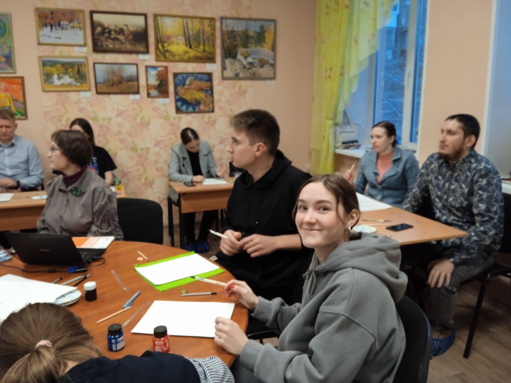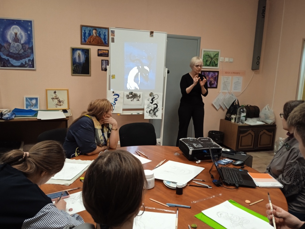 2 декабря в рамках взаимодействия студенты группы Нт-405о СР направления подготовки «Социальная работа» под руководством канд. ист. наук, доцента Н. А. Тарасовой и канд. пед. наук, доцента, Т. Ю. Основиной отработали еще одну технику арт-терапии – изо-терапию на базе Муниципального образовательного учреждения дополнительного образования детей «Детско-юношеский центр „Меридиан”» и НТМОО «Центр общественных инициатив» (НКО «Радуга»). Руководитель центра Ю. В. Тулькуева познакомила студентов с разнообразными мифами и традициями изображения таких символов, как птицы, бабочки и драконы и их значением в разных культурах. Педагог ДЮЦ «Меридиан» Софья Францевна Орджеховская провела мастер-класс «Птицы, бабочки, драконы» в китайской технике «по сырому» с использованием таких материалов, как тушь, акрил, акварель.