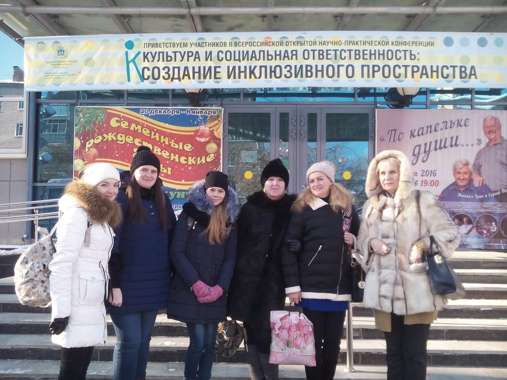 11 ноября 2016 года студенты 1, 3 и 4 курсов дневного отделения и 4 курса заочного отделения факультета психолого-педагогического образования приняли участие во II Всероссийской открытой научно-практической конференции «Культура и социальная ответственность: создание инклюзивного пространства», организованной Управлением культуры Администрации города Екатеринбурга, Екатеринбургской детской школой искусств № 4 «АртСозвездие» на базе Муниципального театра балета «Щелкунчик».