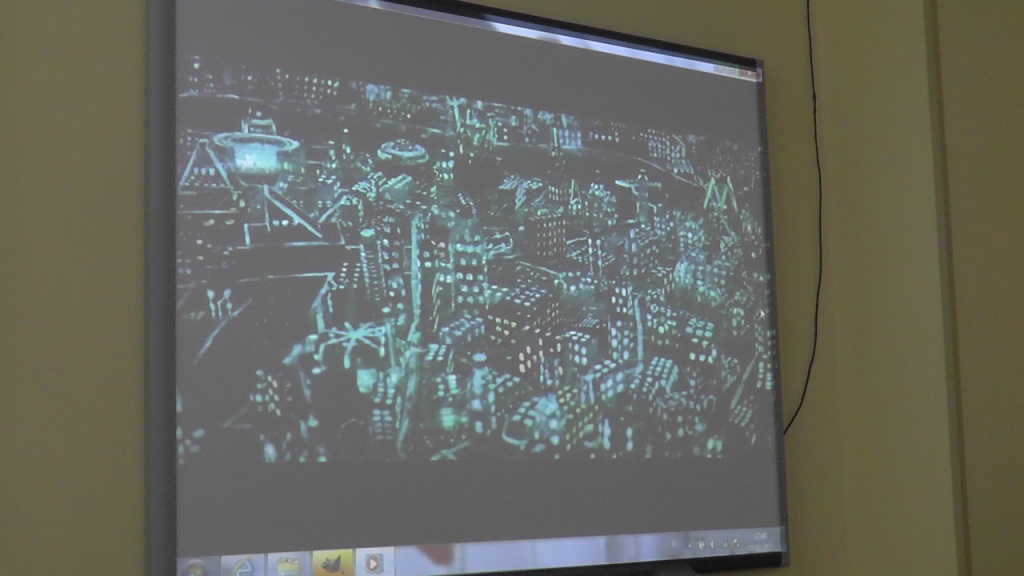 Владимир Селезнев – выпускник художественно-графического факультета, ныне состоявшийся и известный художник, куратор выставок современного искусства. Владимир рассказал о ранних своих проектах, осуществленных им и арт-группой ZerGut некогда на худграфе в рамках дипломной работы. О своих уже профессиональных выставках и проектах, география которых широка – от Екатеринбурга и Москвы до Киля (Германия) и Каннама (часть Сеула, Южная Корея). Показал самые известные свои работы, например, знаменитый «Метрополис», инсталляцию, которая в темноте кажется ночным городом с его цепочками огней, а в дневном свете предстает грудой мусора. Инсталляция действительно сделана из ненужных, выброшенных вещей. В комнате, где она находится, с периодичностью в несколько секунд включается и выключается свет. И зрители видят то романтический ночной город, то самые бросовые, банальные предметы – пакеты из-под сока, йогурта, пластиковые бутылки и т. д. Причем эти предметы художник собирает сам в тех городах и странах, где он представляет свою работу. «Метрополис» уже был создан для Екатеринбурга, Перми, Казани, Краснодара, Санкт-Петербурга, Москвы, Сеула и других городов. Это очень глубокая, философская вещь. Провокативная художественная форма делает ярче, зримей вопросы о том, что художник волен выбирать для собственного произведения любой материал (медиа, как говорят современные художники), люди творят равно прекрасное (города) и безобразное (мусор), жизни свойственен дуализм, а художник может выступать как исследователь-урбанист, который изучает городские коммуникации, и археолог, восстанавливающий облик культуры по бытовым отходам.