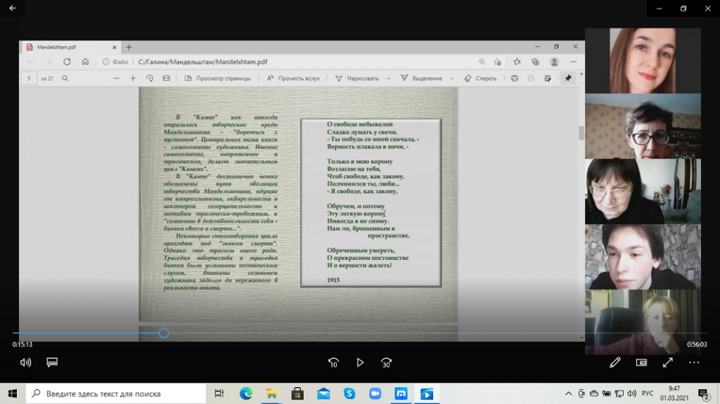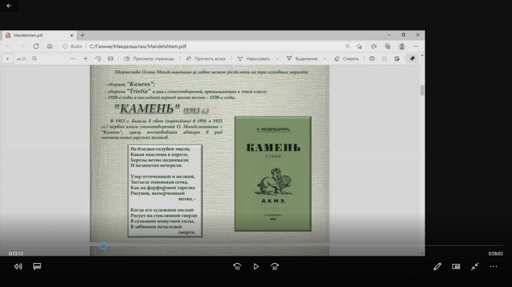 Во время лекции Галина Анатольевна сообщила наиболее значимые факты биографии поэта, рассказала об основных особенностях его творчества, а также поделилась собственными впечатлениями от знакомства с произведениями Мандельштама. Особое внимание было уделено первому сборнику поэта «Камень», а также трагическим событиям в его жизни: арестам, ссылке в Чердынь и Воронеж, трагической гибели. Г. А. Авдеева обратила внимание на то, что еще в юности Мандельштам сделал свой выбор в пользу поэзии вечного, а не сиюминутного, злободневного. Мандельштам в большей степени выразил в своем творчестве основные постулаты акмеизма, сумел соединить внимание к детали внешнего мира с проникновением в мир метафизический.