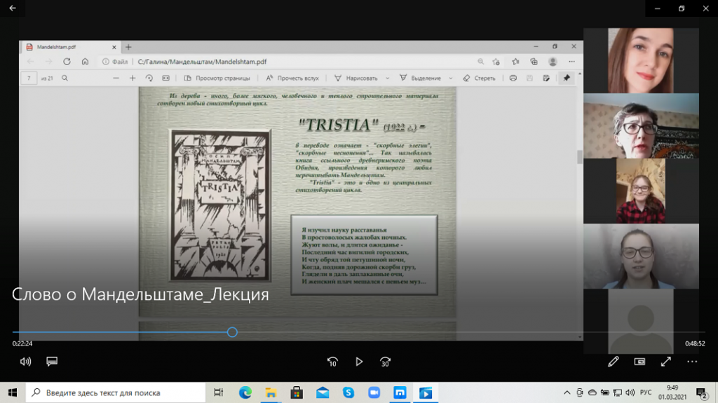Эти стихотворные строки в исполнении группы «Сансара» прозвучали в начале открытой лекции «Слово о Мандельштаме», которая была посвящена 130-летию со дня рождения поэта. Инициатором и автором лекции была доцент кафедры ИЯиРФ Галина Анатольевна Авдеева. Слушателями стали студенты всех курсов профиля «Русский язык и литература» ФФМК. Активное участие в мероприятии приняли студенты групп Нт-104оРЛТ и Нт-401оРЛТ: Алена Бубнова, Мария Плохих, Полина Куренкова, Влад Шитов, Арина Догадина. Студенты прочитали любимые стихотворения О. Э. Мандельштама.