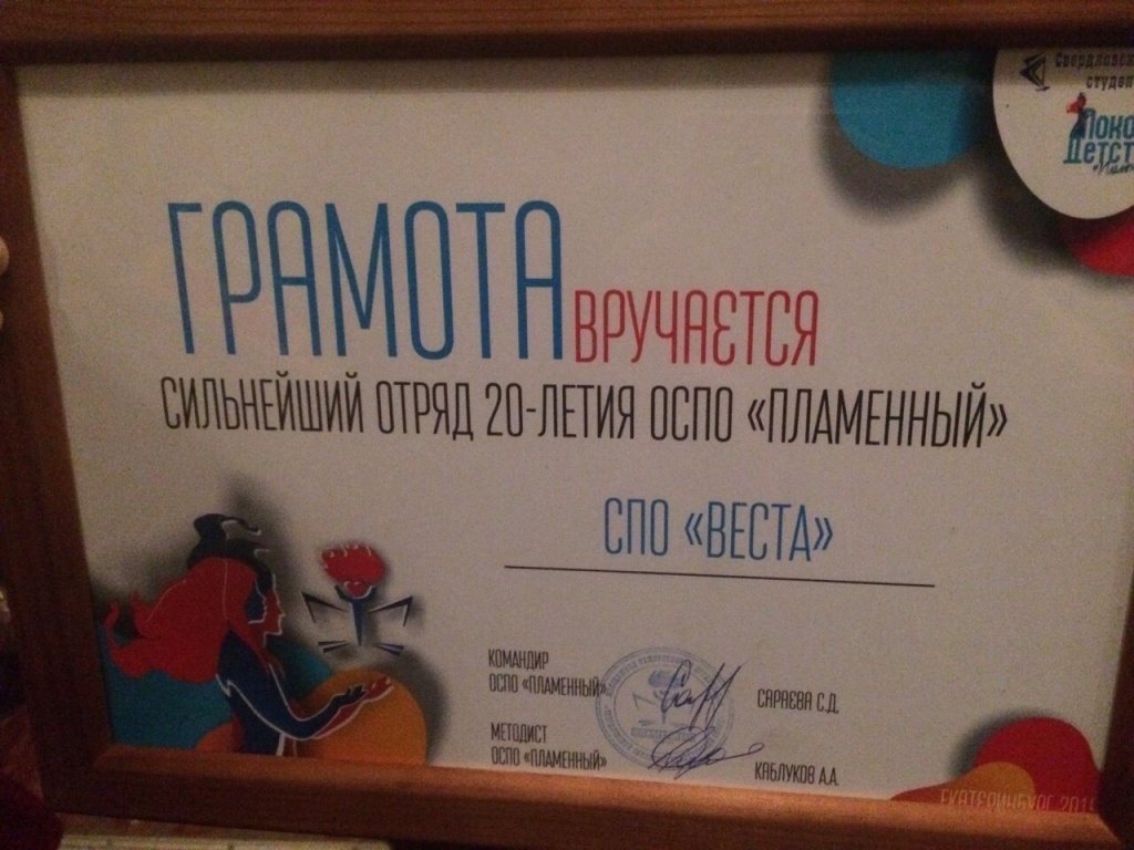 Не обошлось и без наград. Среди них – «Вожатский дебют», которого были удостоены студентки НТГСПИ Юлия Нехорошкова (СПО «Веста») и Евгения Васькина (СПО «ИмпериО»). Кроме того, СПО «Веста» был отмечен как один из восьми сильнейших отрядов двадцатилетия за свой долгий и упорный труд. Завершился концерт гимном ОСПО «Пламенный».