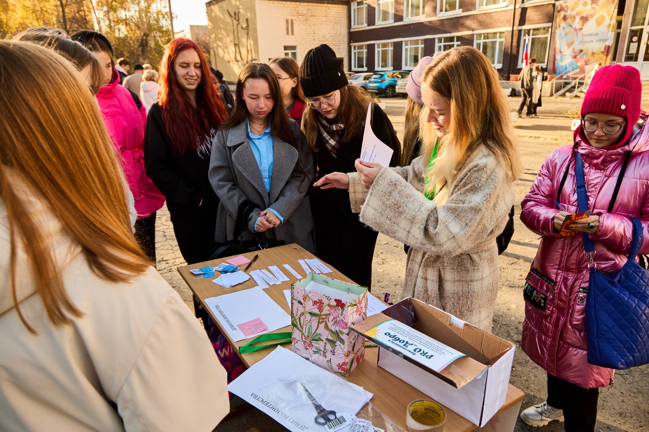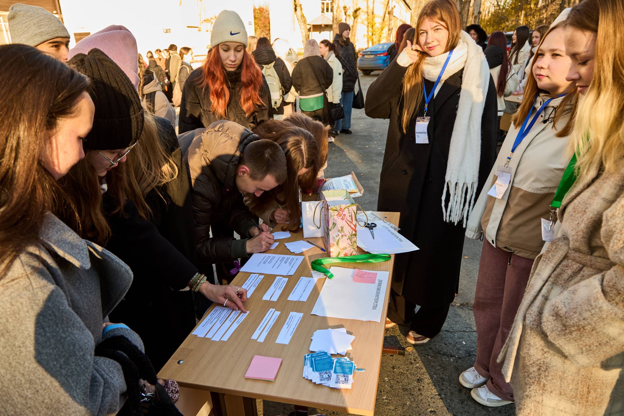 Добровольческое объединение «PRO_Добро» создало на своей площадке атмосферу тепла и созидания. Первокурсники с энтузиазмом придумывали креативные окончания к известным песням о добре, разрабатывали мотивирующие девизы волонтеров и обменивались добрыми пожеланиями, записанными на красочных-стикерах.