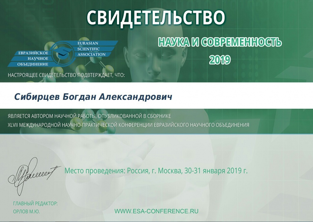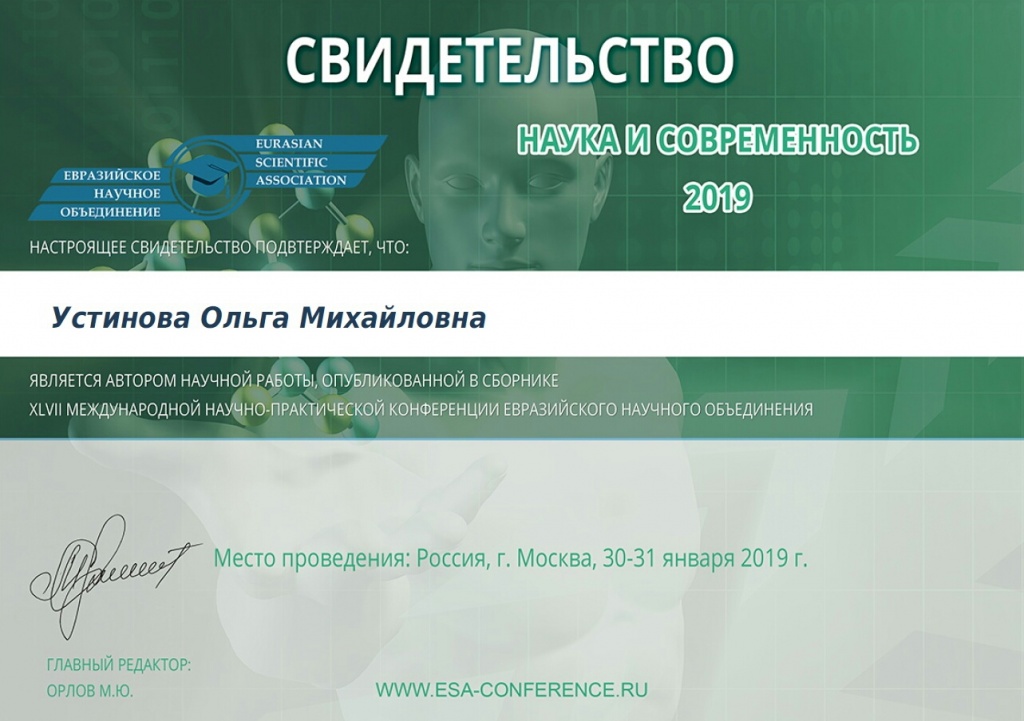 В журнале Евразийского научного объединения (РИНЦ) опубликованы научные статьи студентов 2-го курса Ольги Устиновой и Богдана Сибирцева. Творческая группа студентов факультета спорта и безопасности жизнедеятельности под руководством профессора кафедры БЖФК доктора медицинских наук Ольги Анатольевны Кожевниковой вышла на финишную прямую – этап подведения итогов научно-исследовательской работы студентов в 2018/2019 учебном году. По итогам работы подготовлено более 10 научных публикаций, две из них уже опубликованы, ну а теперь студенты готовятся к очному участию в научно-практической конференции факультета.