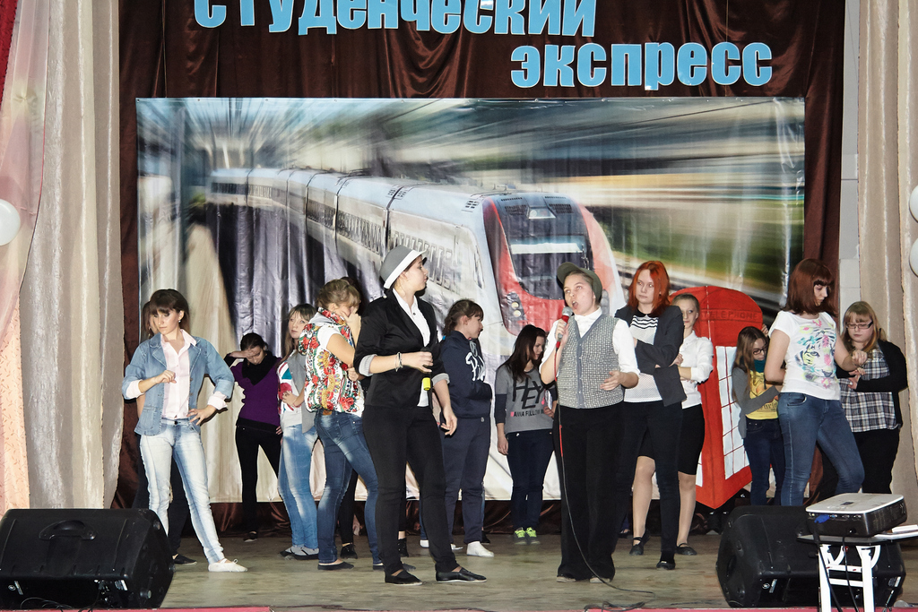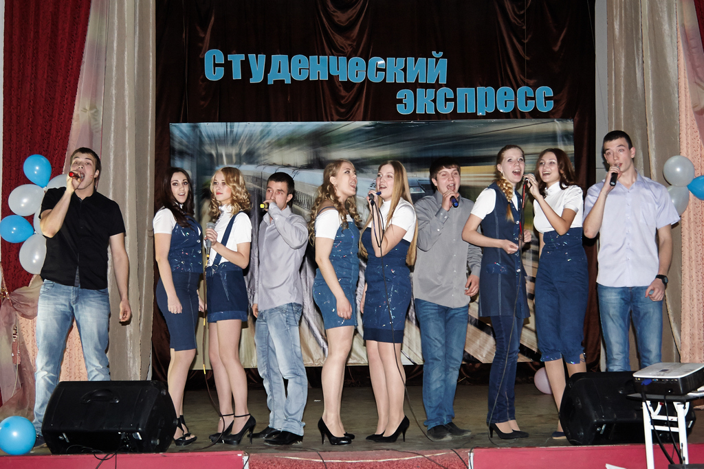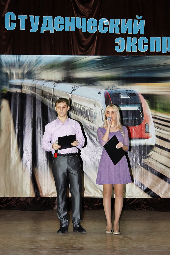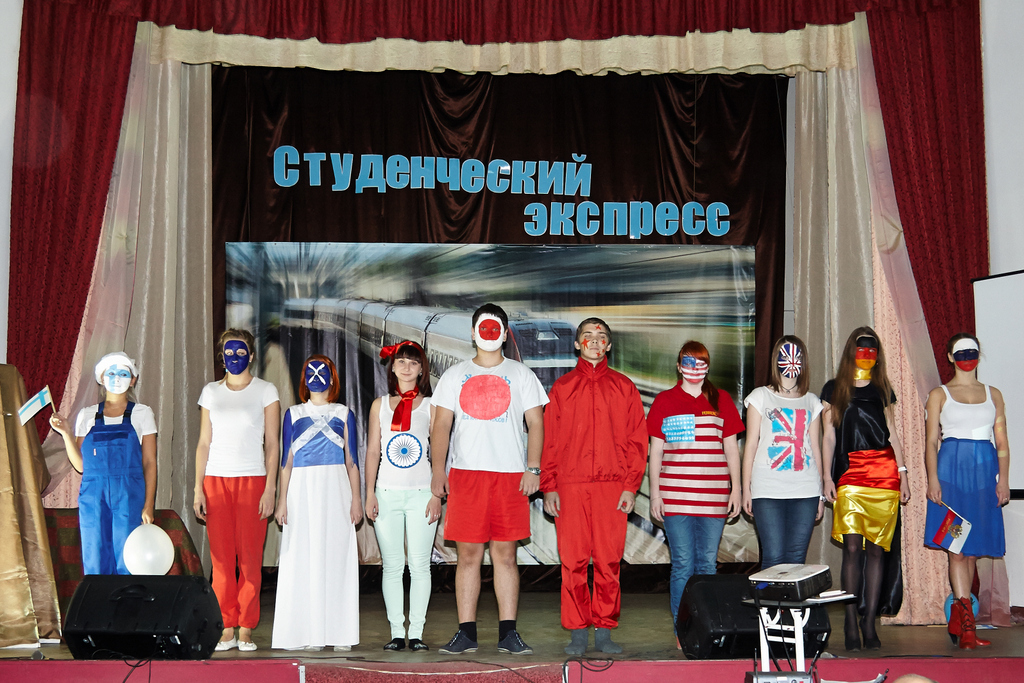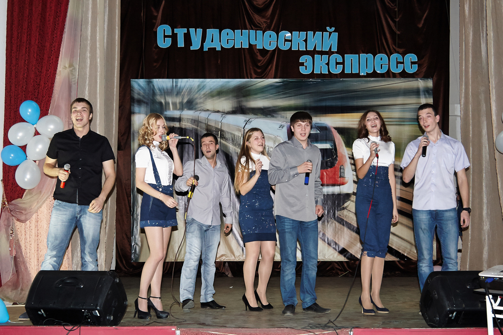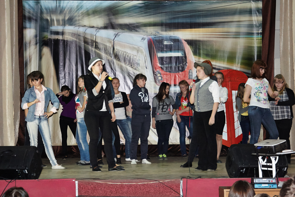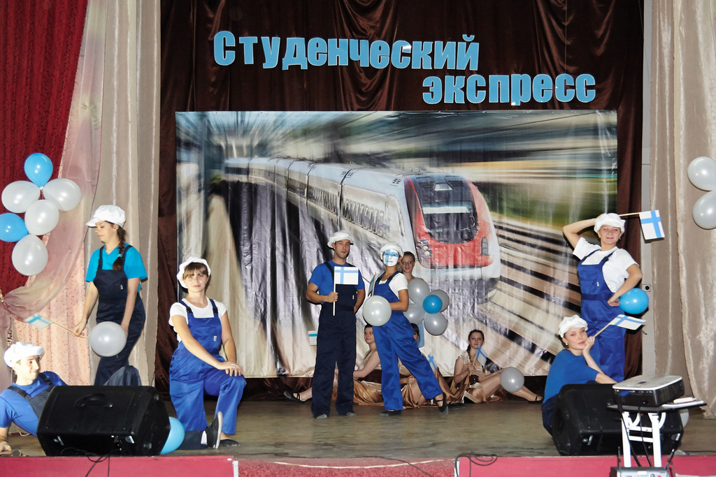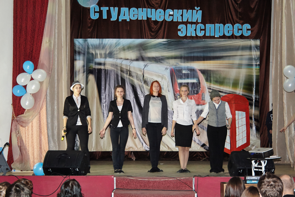 В 14.30 в актовом зале состоялся праздничный концерт. Поезд под названием “Студенческий экспресс” отправился с нашими студентами и преподавателями в разные страны, вели экскурсию проводники Михаил и Анастасия.
