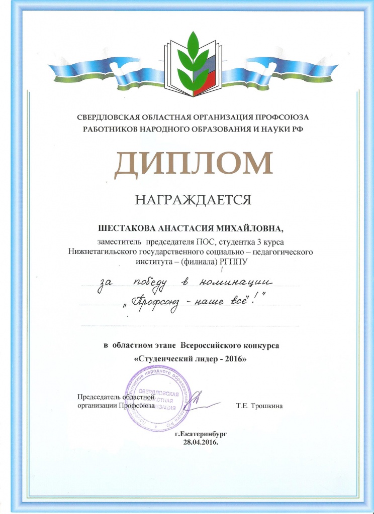 С 27 по 29 апреля в пансионате «Селен» прошел областной этап российского профсоюзного конкурса «Студенческий Лидер 2016». От НТГСПИ участвовала профорг социально-гуманитарного факультета Анастасия Шестакова. С ней ездила группа поддержки, которая во время конкурса проходила учебу актива и обменивалась опытом с другими профсоюзными организациями. Анастасия Шестакова выиграла в номинации «Профсоюз – наше все!».