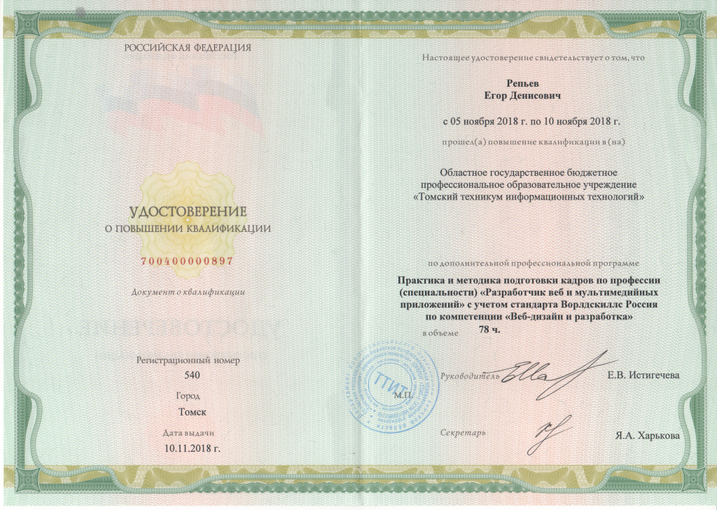 – В период с 5 по 10 ноября я был в чудесном городе Томске на программе повышения квалификации от Союза WorldSkillsRussia, которая называлась «Практика и методика подготовки кадров по специальности „Разработчик веб- и мультимедийных приложений по компетенции Веб-дизайн и разработка” с учетом стандарта WorldSkillsRussia». Во время прохождения этой программы нам рассказали про то, что такое UI/UX, как работать со студентами во время прохождения практик, а также после того, как они закончат обучение, рассказывали про заполнение чемпионатной документации, о фреймворке Yii, о библиотеках jQuery, Angular и т. д., – делится своими впечатлениями Егор.