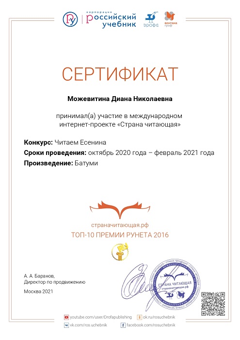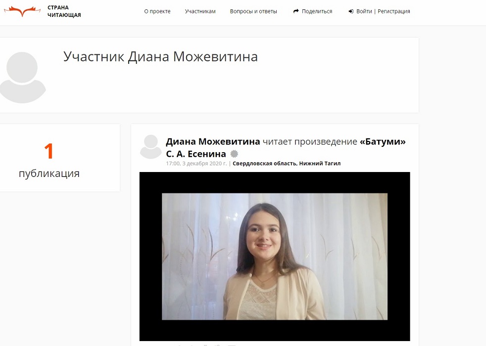 Помимо сертификата участника, полученного Дианой, ее чтецкая интерпретация стихотворения Сергея Есенина «Батум» будет отображена на глобальной «читающей карте» проекта.