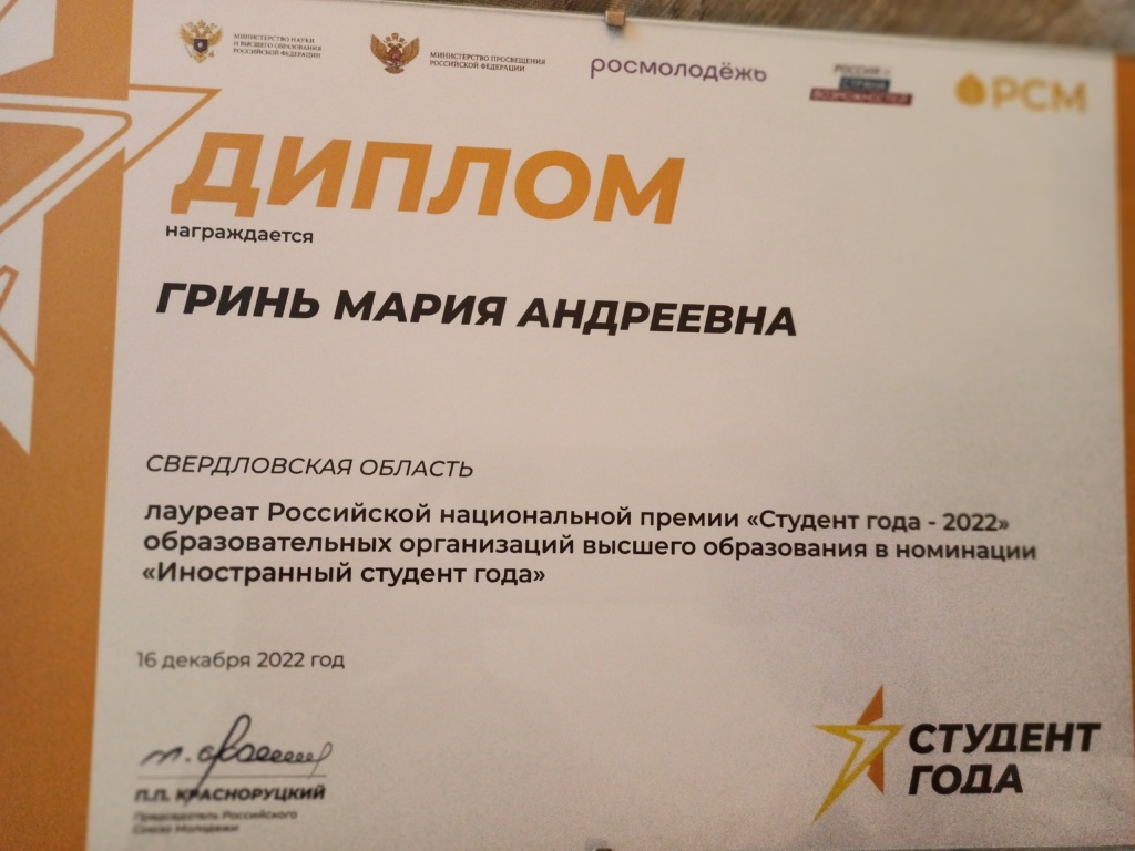 Студентка 4 курса СГФ Мария Гринь стала лауреатом Национальной премии «Студент года» в номинации «Иностранный студент»