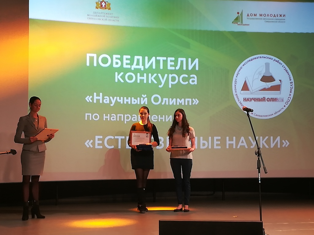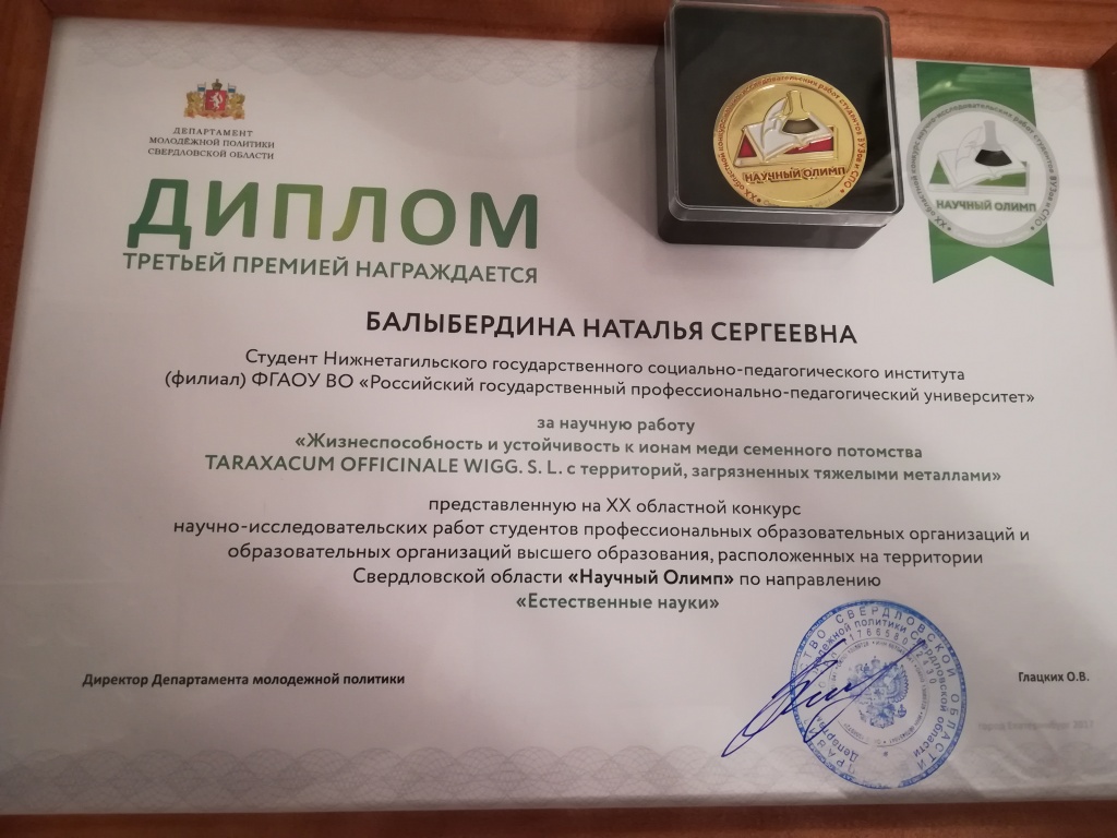 Студентка 4 курса ФЕМИ Наталья Балыбердина заняла третье место на ХХ конкурсе «Научный Олимп» по направлению «Естественные науки». 30 ноября 2017 г. состоялась торжественная церемония награждения победителей и их руководителей в конференц-зале Ельцин Центра. На конкурс Наталья отправила научно-исследовательскую работу на тему «Жизнеспособность и устойчивость к ионам меди семенного потомства TARAXACUM OFFICINALE WIGG. S. L. с территорий, загрязненных тяжелыми металлами».