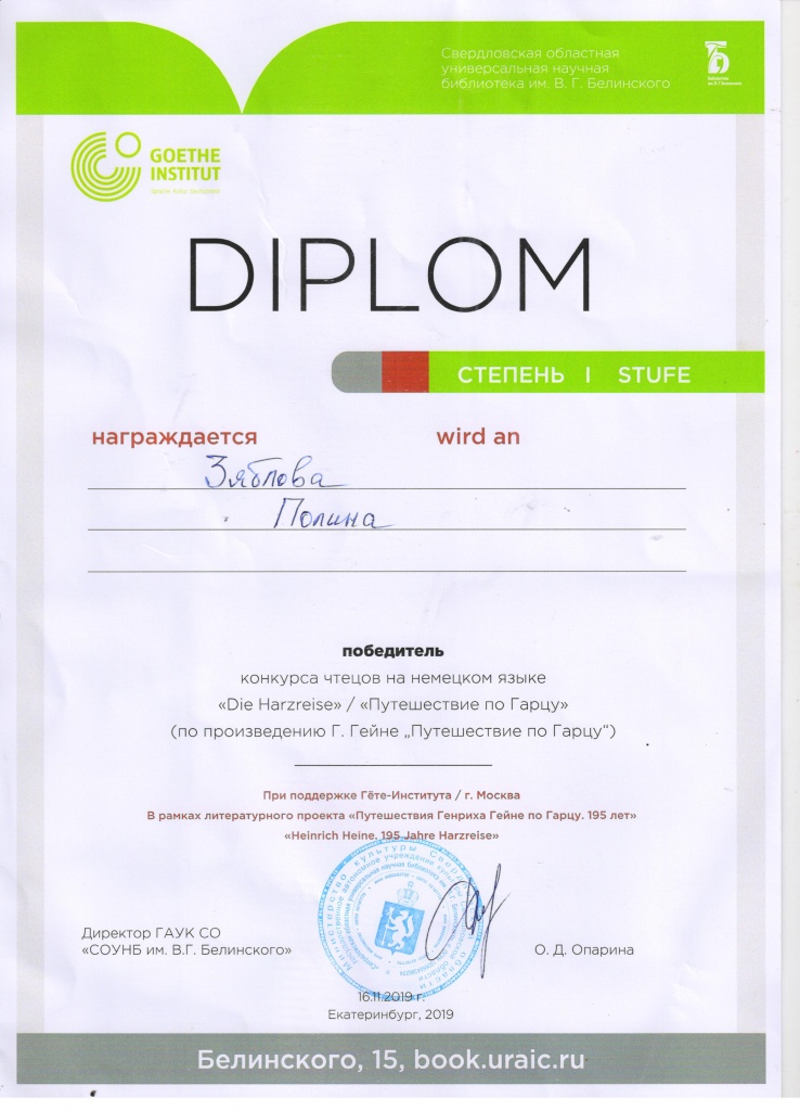 16 ноября 2019 г. в Областной библиотеке им. В. Г. Белинского состоялся Областной конкурс чтецов на немецком языке, посвященный великому немецкому поэту Генриху Гейне и его произведению «Путешествие по Гарцу».