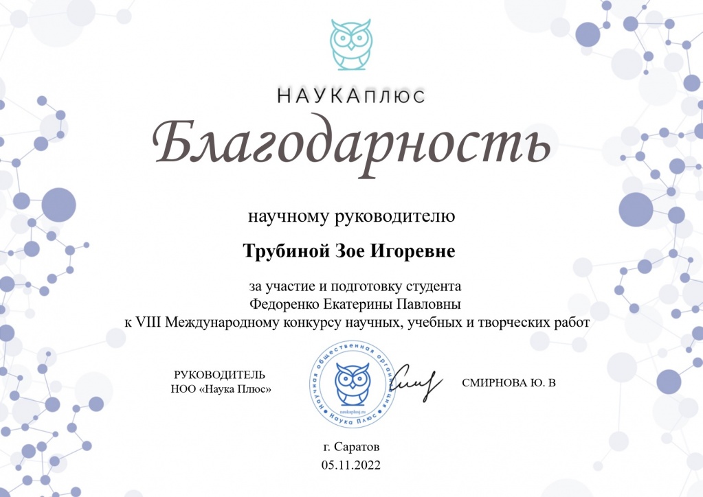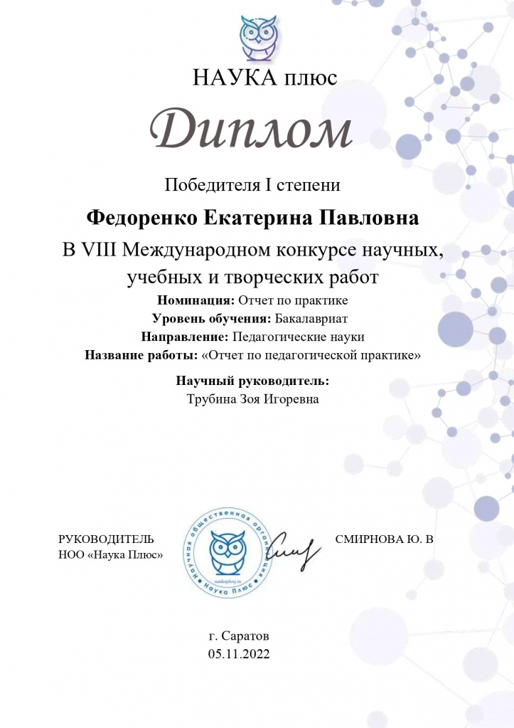 Студентка 4 курса ФФМК Екатерина Федоренко стала победителем I степени в VIII Международном конкурсе научных, учебных и творческих работ (г. Саратов). Ее работа, выполненная под руководством канд. пед. наук З. И. Трубиной, была отмечена в номинации «Отчет по практике», а также удостоена сертификата для оплаты публикации научной статьи с индексацией РИНЦ.