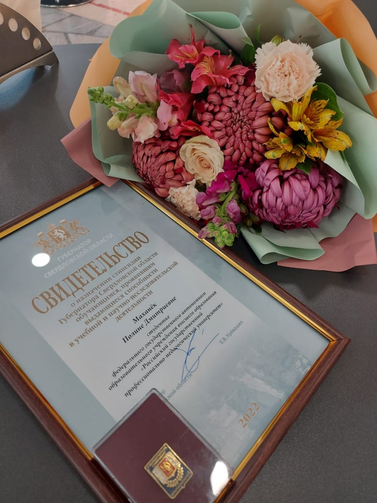 7 декабря 2022 г. студентка факультета психолого-педагогического образования Полина Дмитриевна Маханек приняла участие в торжественной церемонии чествования стипендиатов Губернатора Свердловской области в соответствии с Указом Губернатора Свердловской области от 11.11.2022 № 570-УГ «О назначении стипендий Губернатора Свердловской области обучающимся по очной форме обучения по образовательным программам высшего образования – программам бакалавриата, специалитета, магистратуры, подготовки научных и научно-педагогических кадров в аспирантуре (адъюнктуре), ординатуры, ассистентуры-стажировки, имеющим государственную аккредитацию, образовательным программам среднего профессионального образования – программам подготовки специалистов среднего звена, имеющим государственную аккредитацию, в 2022 году».