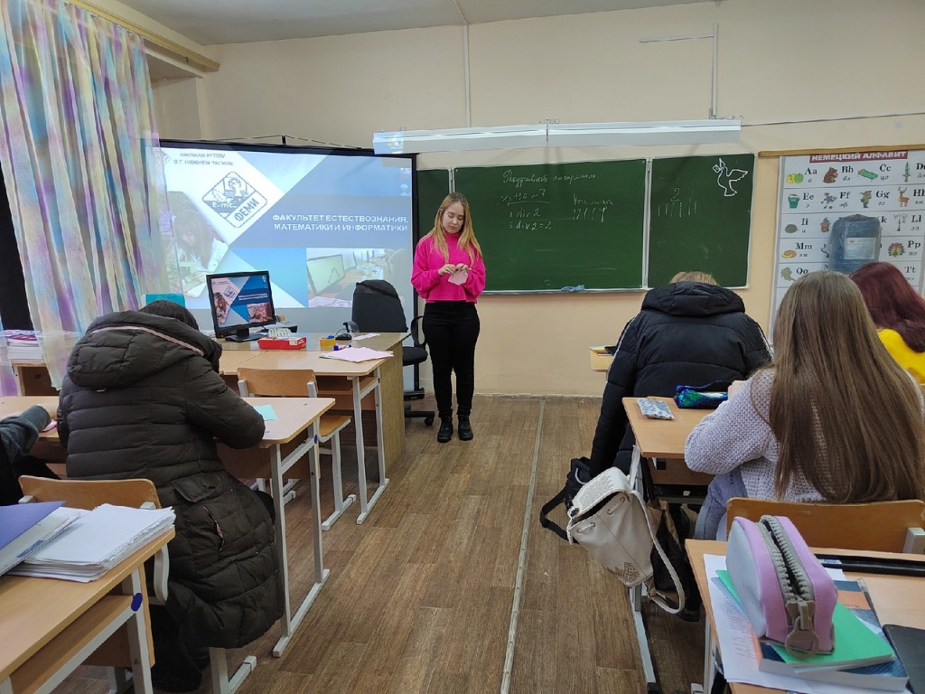 Инициативная группа студентов 3 и 4 курсов факультета естествознания, математики и информатики предложила сценарий серии профпроб и социальных практик по педагогической деятельности для старшеклассников. Руководителями инициативной группы выступают Е. В. Вязовова, зам. декана ФЕМИ по воспитательной работе, и М. В. Мащенко, зав. кафедрой ИТ. И уже во второй раз такие профробы прошли 22 декабря в МБОУ СОШ № 1 им. Н. К. Крупской и МБОУ СОШ № 23 им. Ю. И. Батухтина.