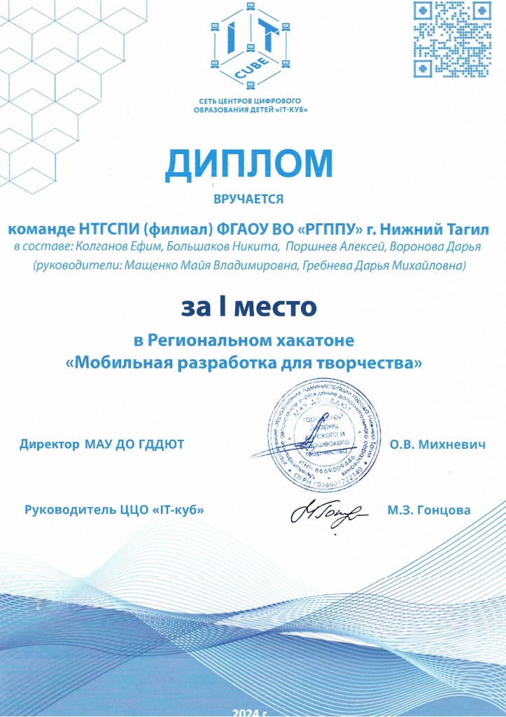 В Городском Дворце детского и юношеского творчества прошел Региональный хакатон по мобильной разработке. В нем участвовала команда факультета естествознания, математики и информатики из четырех человек (Колганов Ефим, Большаков Никита из группы Нт-301о ИУЦ и Поршнев Алексей и Воронова Дарья из группы Нт-404о ПИУ). Ребята выбрали для разработки кейс «All-ассистент по проведению экскурсии без экскурсовода». Они пытались сделать мобильного помощника (голосового и текстового) для проведения экскурсии в Нижнетагильском музее искусств, опирающегося на метки на экспонатах. Им предстояло разработать понятный и удобный интерфейс, продумать варианты работы программы без доступа в интернет. Наши студенты очень достойно справились с поставленной задачей и заняли 1 место. Поздравляем команду ФЕМИ с заслуженной победой!