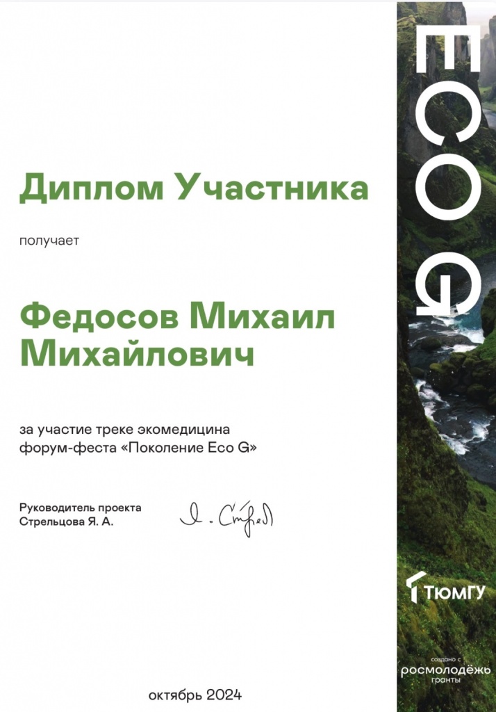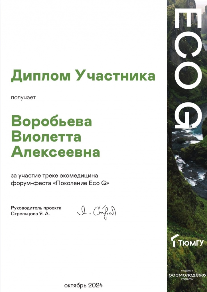 Студенты факультета естествознания, математики и информатики Виолетта Воробьева и Михаил Федосов посетили форум-фестиваль «Поколение Eco G», который состоялся в городе Тюмени при поддержке Росмолодежи и Тюменского государственного университета (ТюмГУ). Мероприятие было организовано в рамках гранта, полученного активистами ТюмГУ и эко-волонтерами, и направлено на активизацию деятельности молодежи в области экологии. Участники форума имели возможность выбрать интересующие их направления, наши студенты выбрали трек «Экомедицина». Целью трека стало обучение базовым принципам фармакологии, заботе об окружающей среде, а также использованию натуральных природных компонентов в косметологии и медицине. Занятия проходили в различных местах Тюмени: аптекарском саду при Тюменском государственном медицинском университете (ТГМУ), корпусе ТюмГУ, «Конторе Пароходства», а также на улице Дзержинской.
