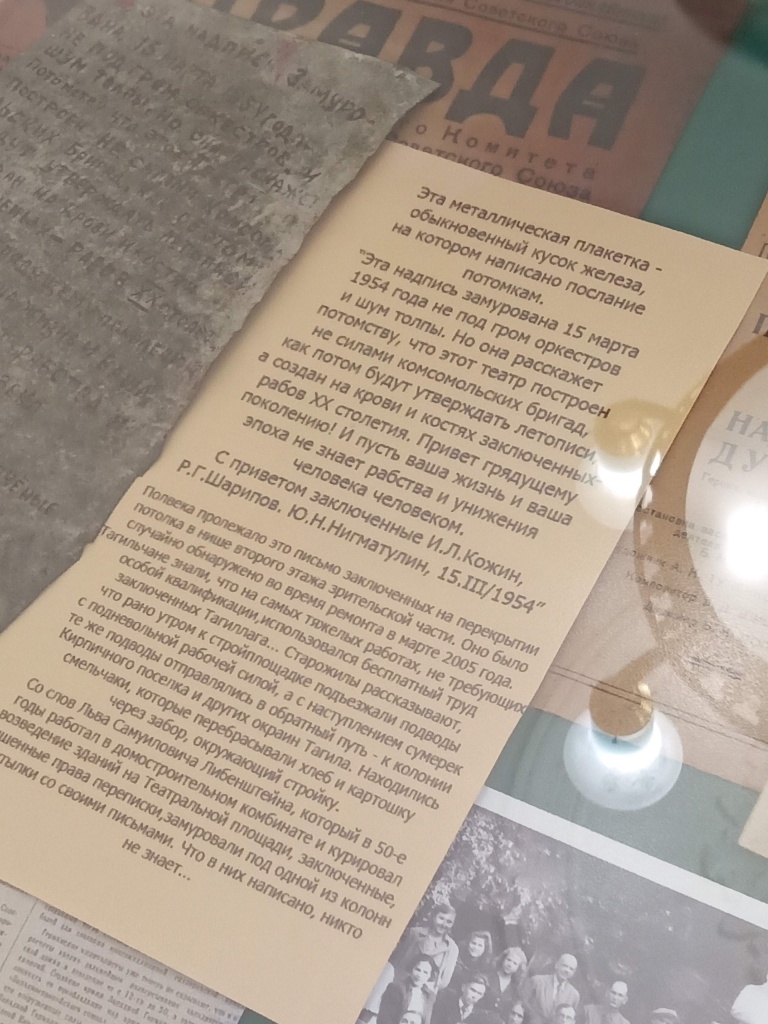 Экскурсия началась сразу же в фойе театра. Затем участники проследовали в музей учреждения, где Мария подробно рассказала об истории создания театра и основных вехах его развития. Студенты узнали и о предшественнике театра им. Мамина-Сибиряка – любительском театре, созданном еще в 1862 году. Увидели уникальную программку спектакля «Без вины виноватые» 1918 года. Один из экспонатов музея вызвал особый интерес – некое послание от строителей театра (заключенных, которые оставили свои имена), замурованное в перекрытие потолка второго этажа в 1954 году. Обнаружено оно было только в 2005 году во время ремонта здания. Особое место в музее отведено для информации о людях, внесших значительный вклад в развитие театра, например, об Изе Высоцкой, Валерии Павловиче Пашнине. В музее также много афиш старых спектаклей, костюмов, реквизита, которые остались от наиболее знаковых постановок.