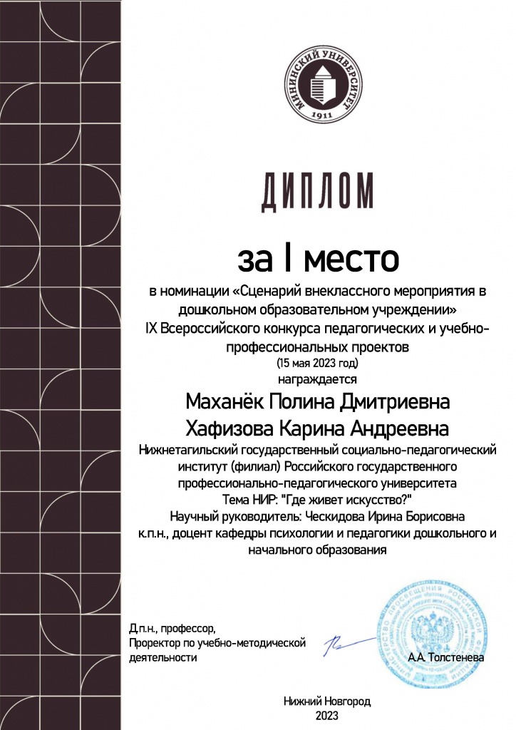 Маханек Полина Дмитриевна, Хафизова Карина Андреевна – 1 место (командный зачет) в номинации «Сценарий внеклассного мероприятия в дошкольном образовательном учреждении»;
