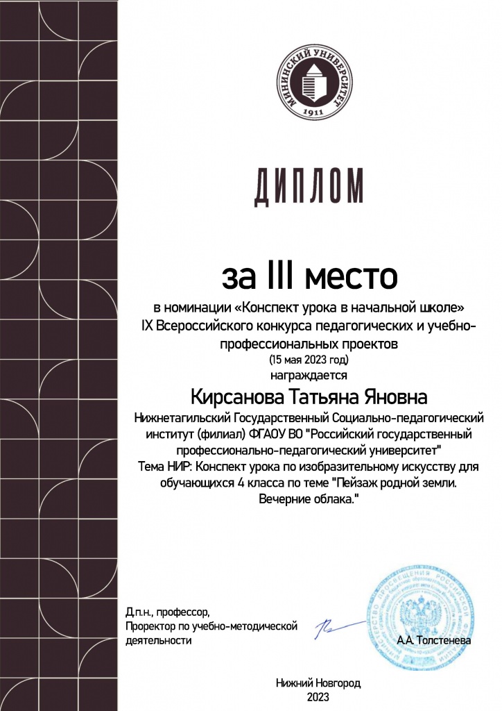 Кирсанова Татьяна Яновна – 3 место в номинации «Конспект урока в начальной школе».