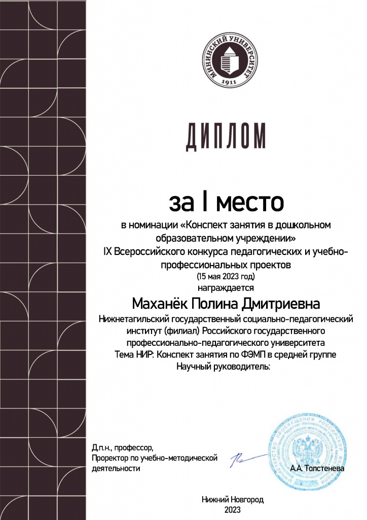 Маханек Полина Дмитриевна – 1 место в номинации «Конспект занятия в дошкольном образовательном учреждении»;