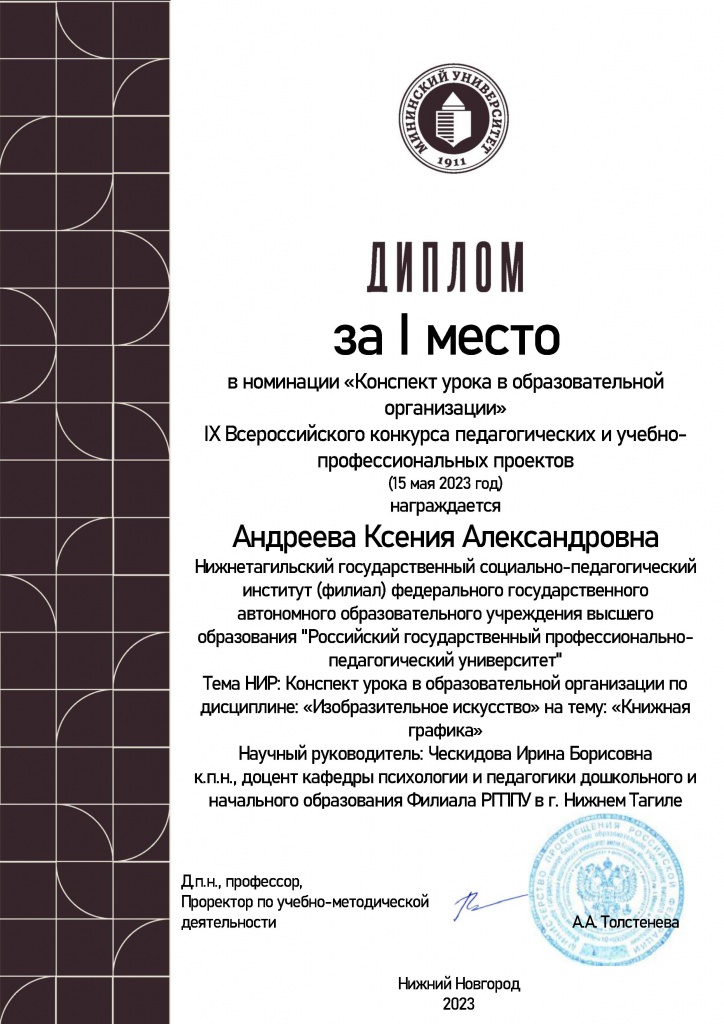 Андреева Ксения Александровна – 1 место в номинации «Конспект урока в образовательной организации»;