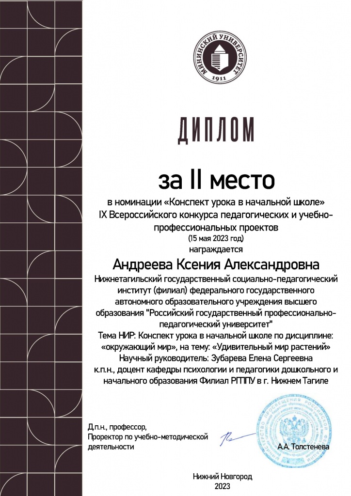Андреева Ксения Александровна – 2 место в номинации «Конспект урока в начальной школе»;
