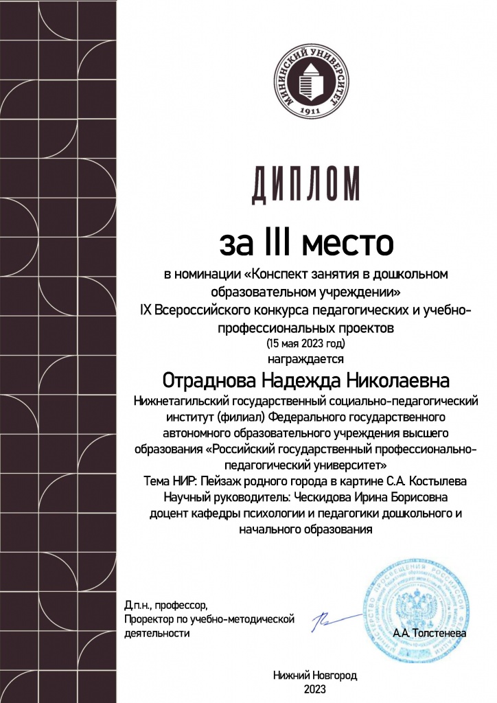 Отраднова Надежда Николаевна – 3 место (командный зачет) в номинации «Конспект занятия в дошкольном образовательном учреждении»;