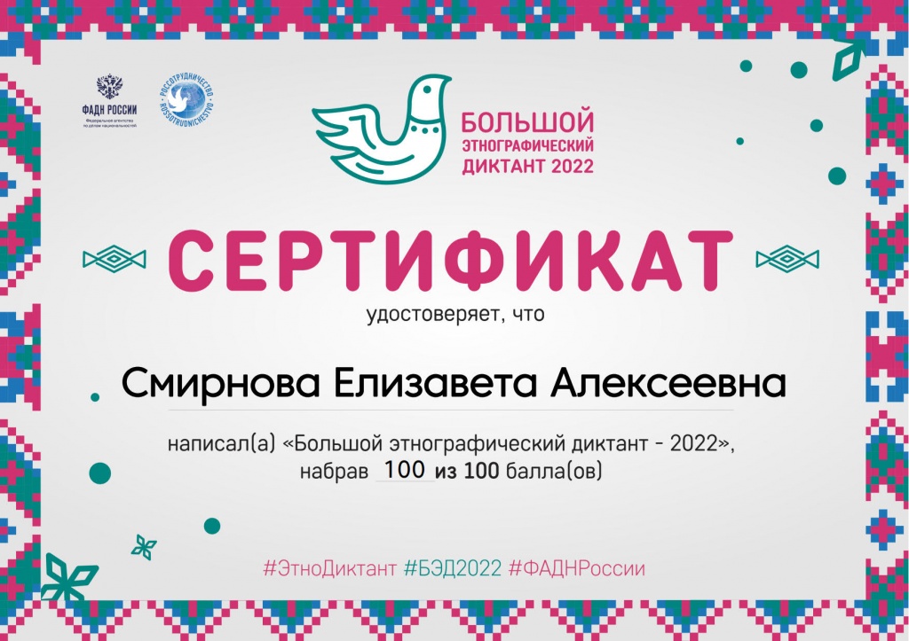 В преддверии Дня народного единства студенты 2 курса профиля «Безопасность жизнедеятельности и дополнительное образование в области туризма» активно поддержали акцию «Большой этнографический диктант-2022». Международная просветительская акция проходит в 2022 году под девизом «Народов много – страна одна!» Участниками Диктанта могут стать все желающие, как жители России, так и зарубежных стран. Задания Диктанта включают две части: 20 вопросов – общефедеральная часть Диктанта, единая для всех участников; 10 вопросов – региональная часть, уникальная для каждого субъекта Российской Федерации. Максимальная сумма баллов за выполнение всех заданий – 100. «Большой этнографический диктант-2022» для студентов – это возможность проверить свои знания об истории и культуре народов нашей страны и малой Родине – Урале. Лучшие результаты показали Иванова Ксения, Пшеничникова Полина, Сидоренко Алёна, Смирнова Елизавета, Ценёв Тимофей.