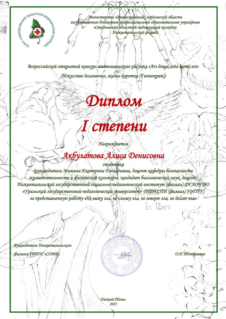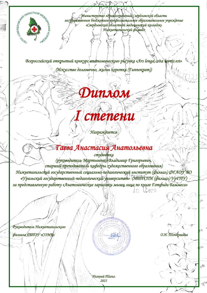 Студенты 1–4 курсов факультета спорта и безопасности жизнедеятельности и факультета художественного образования под руководством преподавателей Екатерины Геннадьевны Мишиной, Анны Владимировны Овчинниковой и Ольги Александровны Гольденберг, Владимира Григорьевича Мартыненко стали победителями и призерами Всероссийского открытого конкурса анатомического рисунка «Ars longa, vita brevis est», организатор которого – Нижнетагильский филиал ГБПОУ «СОМКФ».