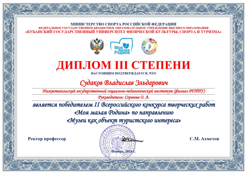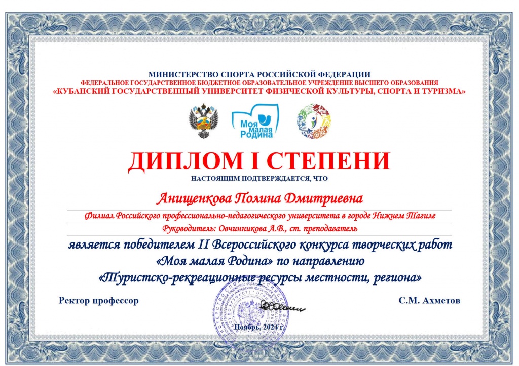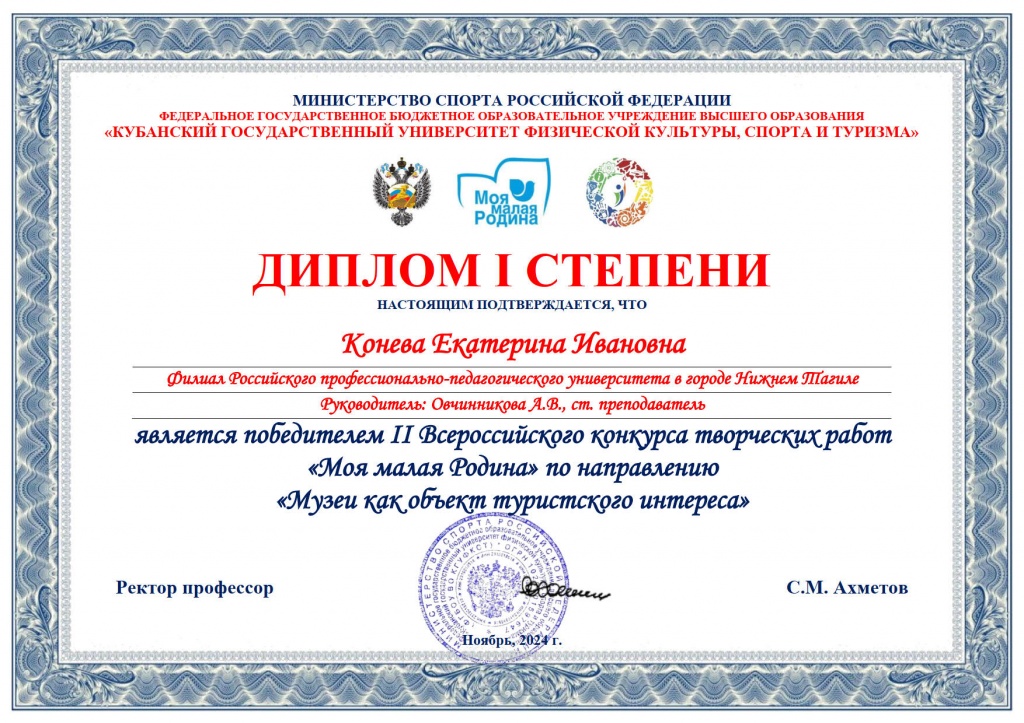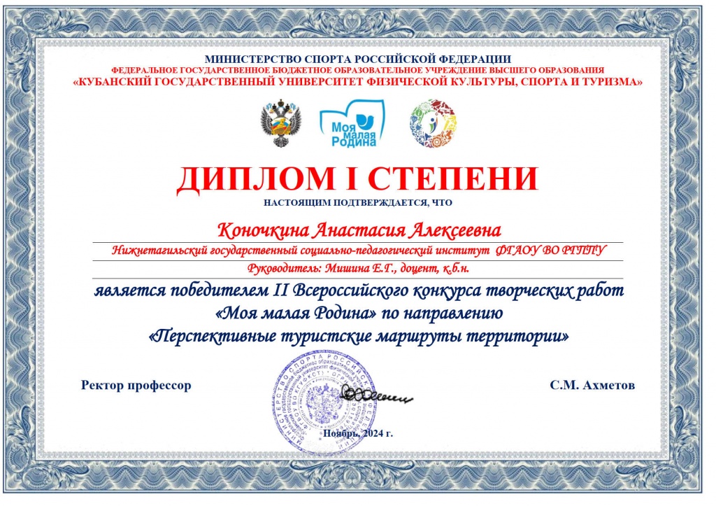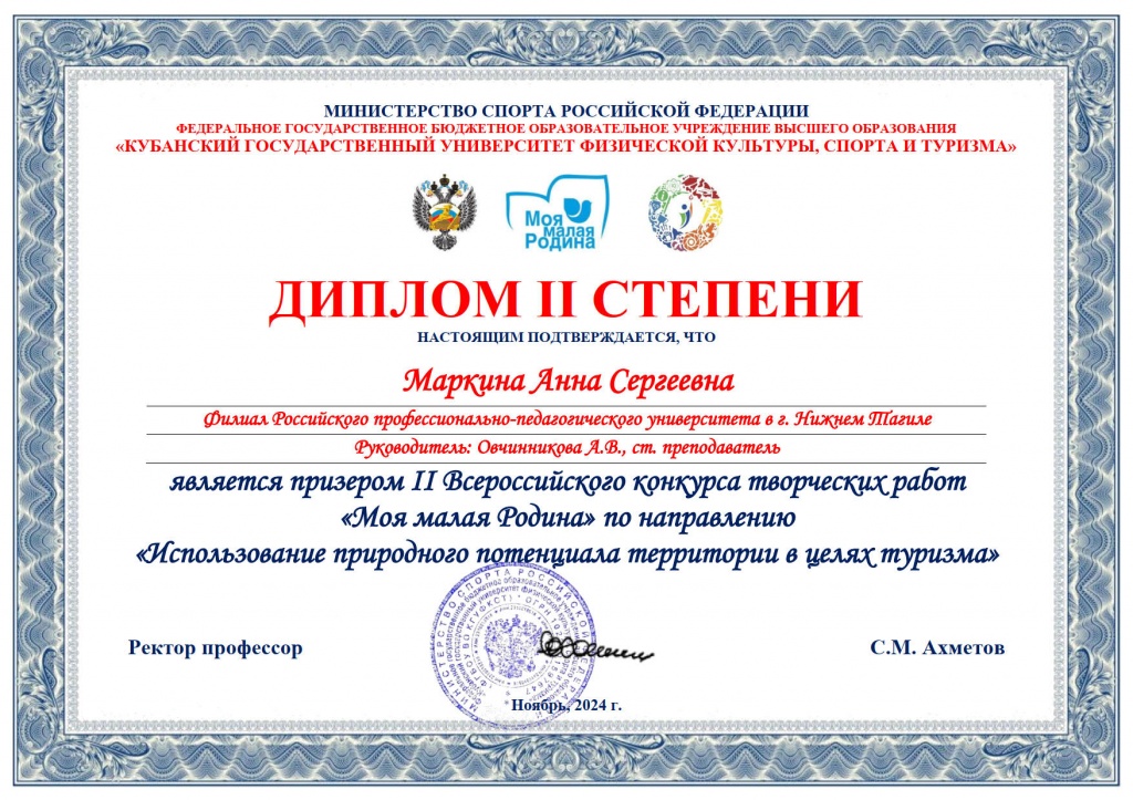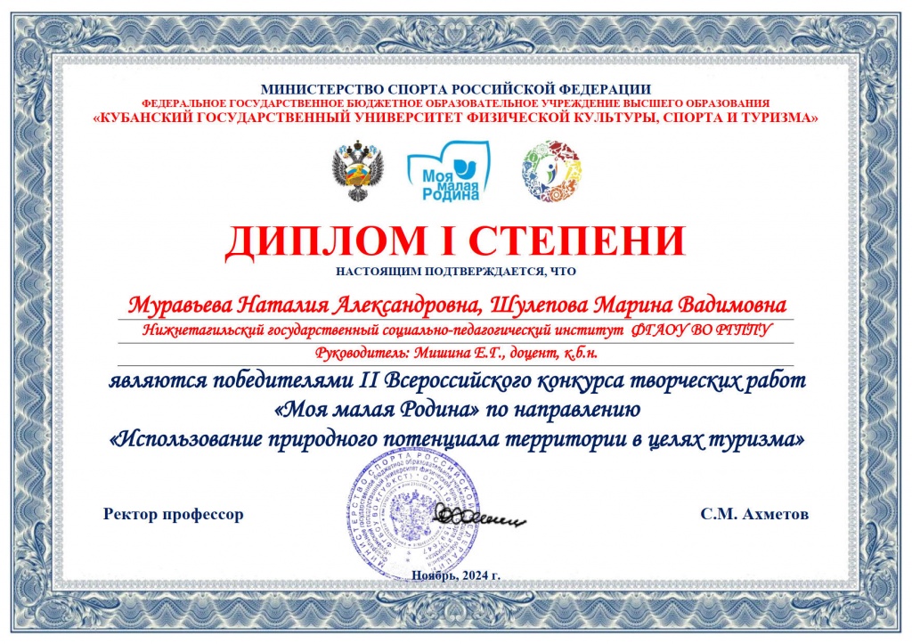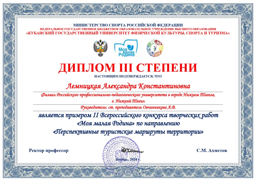Студенты 2–4 курсов факультета спорта и безопасности жизнедеятельности под руководством преподавателей кафедры БЖФК Екатерины Геннадьевны Мишиной, Анны Владимировны Овчинниковой и Ольги Анатольевны Сергеевой стали победителями и призерами II Всероссийского творческого конкурса «Моя малая Родина», который был организован и проведен в рамках воспитательной и профориентационной деятельности кафедры туризма и гостеприимства Кубанского государственного университета физической культуры, спорта и туризма. В нем приняли участие обучающиеся вузов, учреждений среднего общего и среднего профессионального образования из различных субъектов Российской Федерации. «Моя малая Родина» – конкурс творческих и креативных проектов и работ в области туризма, созданный с целью содействия эффективному развитию творческой и креативной деятельности обучающихся, патриотическому воспитанию молодежи.