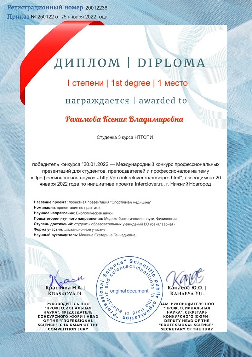 Студенты факультета спорта и безопасности жизнедеятельности вместе со своим научным руководителем – старшим преподавателем кафедры БЖФК А. В. Овчинниковой стали победителями Международного конкурса научных, методических и творческих работ «Родина: общество, безопасность, экология». Организаторами конкурса являются ФГБОУ ВО «Ижевский государственный технический университет им. М. Т. Калашникова», кафедра «Общественные науки», историко-культурное молодежное общество «Самобытная Вятка» и АНО «Восток».