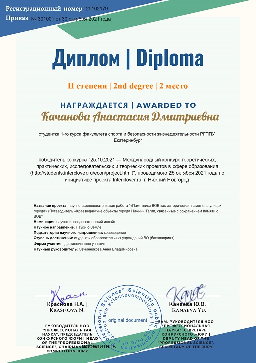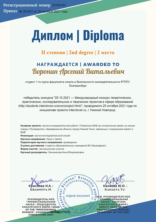Студенты ФСБЖ представили на конкурс научно-исследовательский проект «Памятники Великой Отечественной войны как историческая память на улицах города» (Путеводитель «Краеведческие объекты города Нижний Тагил, связанные с сохранением памяти о Великой Отечественной войне») в номинации «Краеведение». Первокурсники Арсений Воронин, Анастасия Качанова, Полина Пшеничникова стали победителями и заняли 2-е место. Поздравляем ребят и желаем им дальнейших успехов.