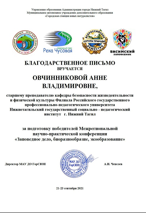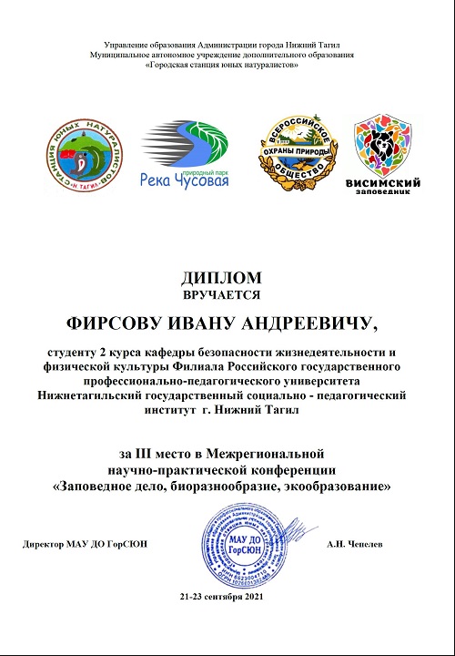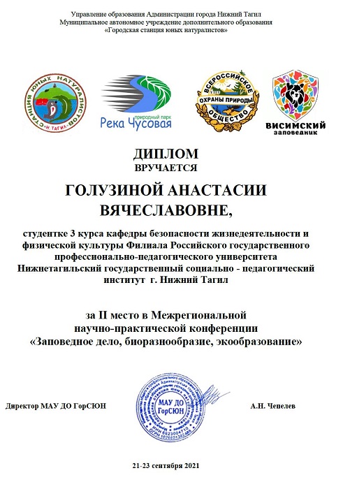 Студенты факультета спорта и безопасности жизнедеятельности Анастасия Голузина (3 курс) и Иван Фирсов (2курс) вместе со своим научным руководителем, старшим преподавателем кафедры БЖФК А. В. Овчинниковой приняли участие в Межрегиональной научно-практической конференции «Заповедное дело, биоразнообразие, экообразование».