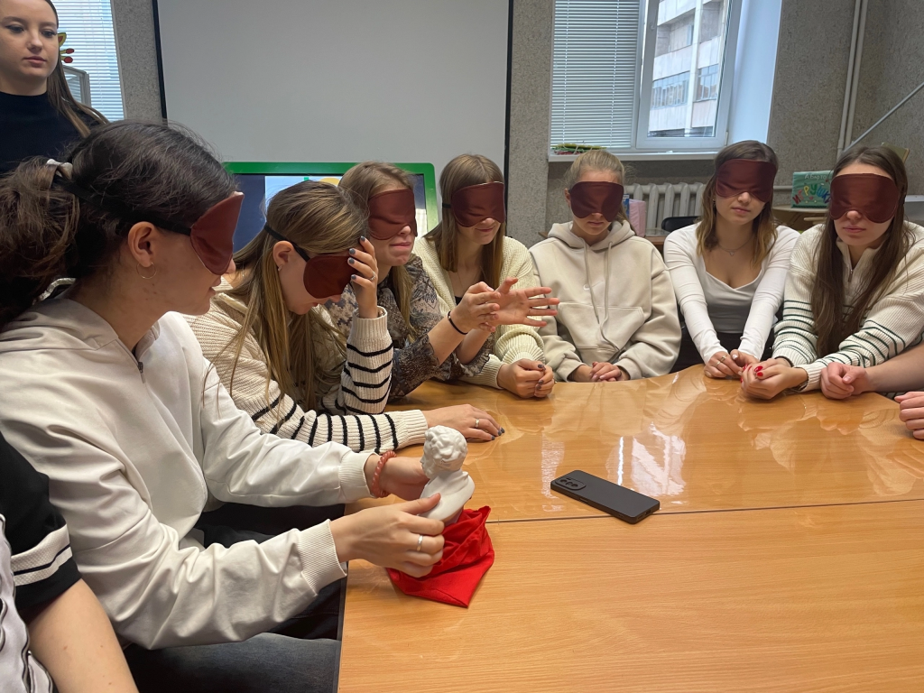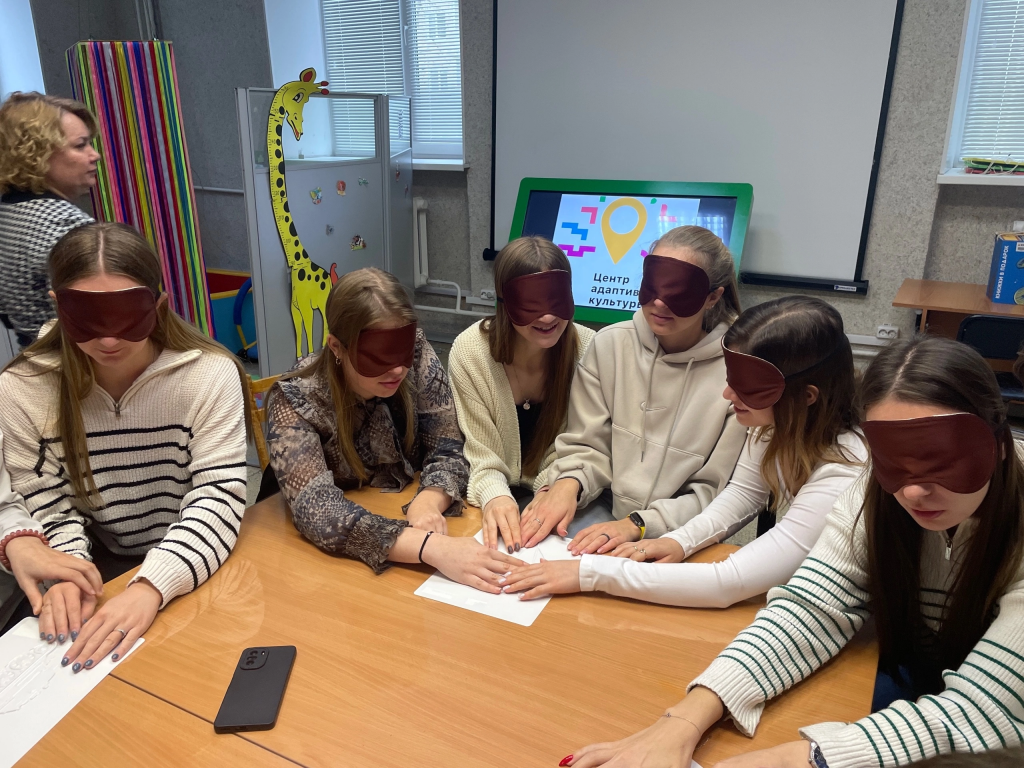 Ребятам предложили надеть повязки на глаза, чтобы в полной мере прочувствовать то, как ощущают себя незрячие люди. Будущие педагоги приняли участие в сеансе симуляционной игры на понимание ощущений незрячего человека. С закрытыми глазами студентам необходимо было выполнить ряд заданий: достать из мешочка наощупь деревянную фигуру и распознать ее; узнать рельефно-графическое изображение (букет тюльпанов, башня на Лисьей горе), «осмотреть» руками бюст писателя, а далее вспомнить и написать строчку из его произведения. После проведения симуляционной игры студентам дали возможность высказаться.