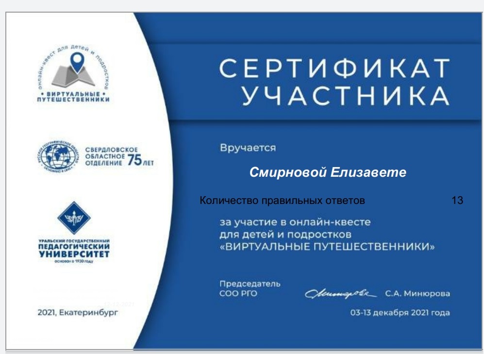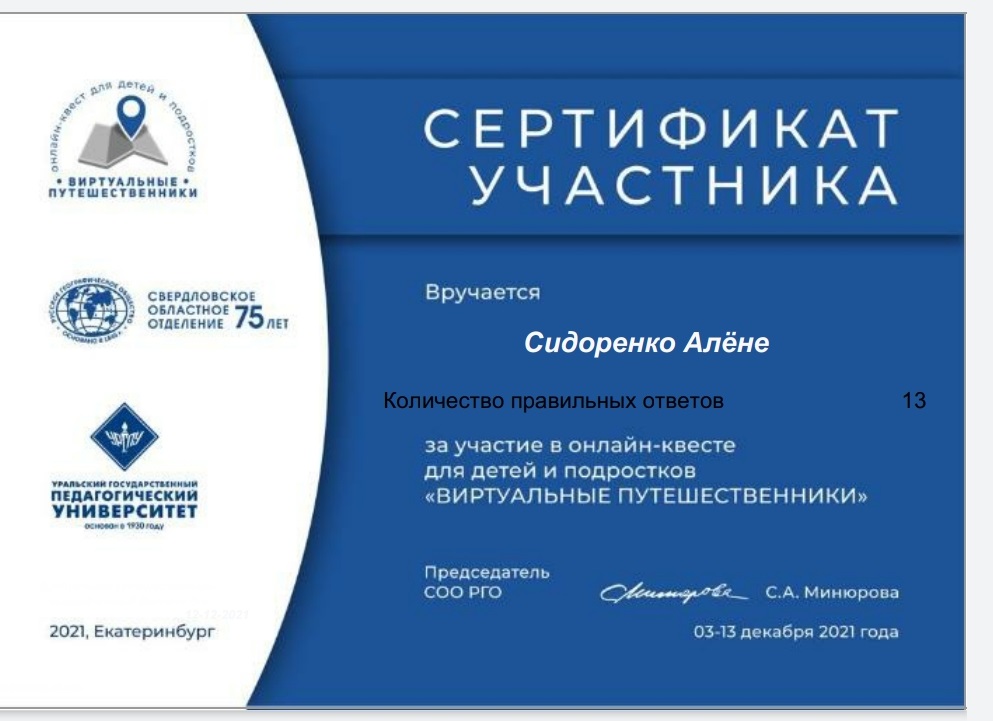 Студентки группы Нт-101о БДО факультета спорта и безопасности жизнедеятельности Алена Сидоренко и Елизавета Смирнова (куратор А. В. Овчинникова) приняли участие в онлайн-квесте «Виртуальные путешественники». Мероприятие было организовано Всероссийской общественной организацией «Русское географическое общество» и ФГБОУ ВО «Уральский государственный педагогический университет».