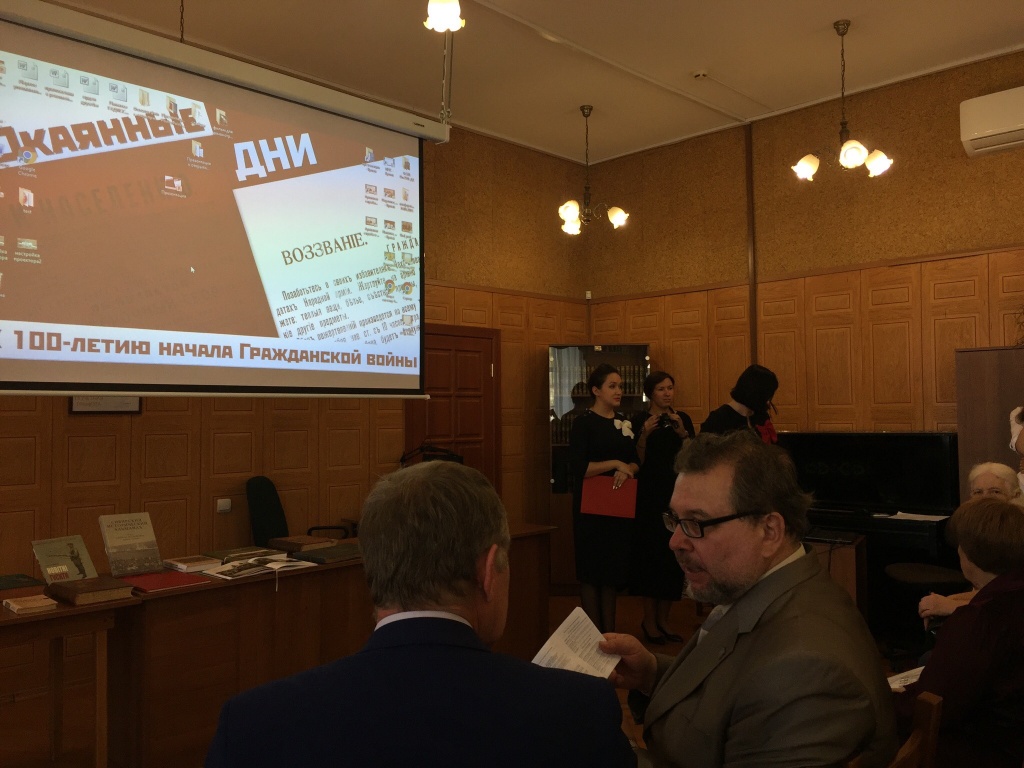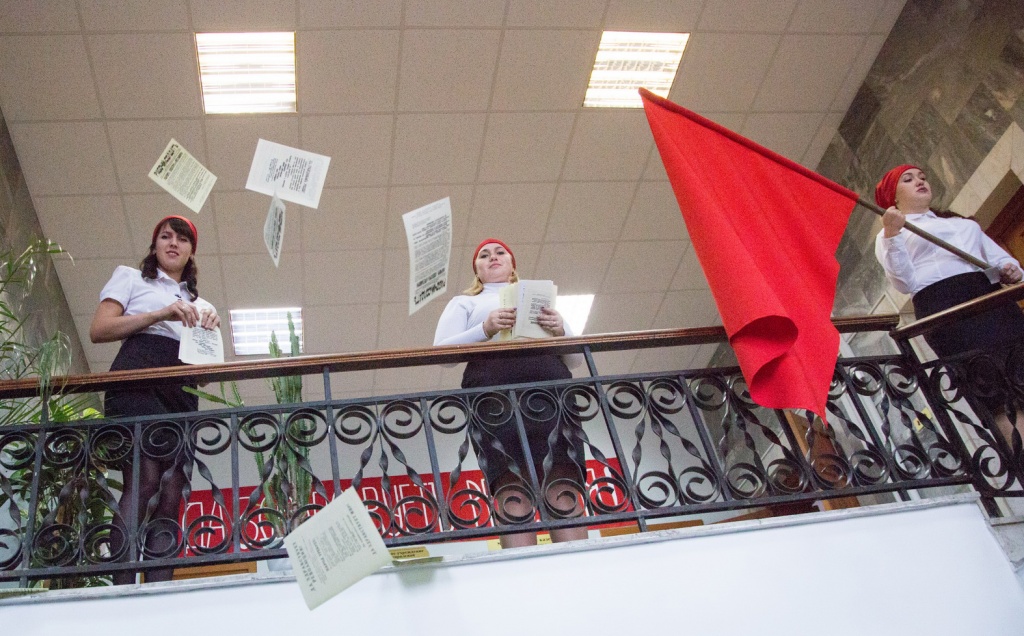 «В фойе посетителей встречали революционерки в красных косынках и памятник вождю пролетариата Владимиру Ленину, к которому несколько человек возложили красные гвоздики. На стенах – плакаты и лозунги, на полу разбросаны листовки с воззваниями к рабочим, солдатам и крестьянам. Создало необходимую атмосферу и театрализованное выступление, подготовленное сотрудниками архива», – рассказывает студент СГФ Рустам Шафигулин.