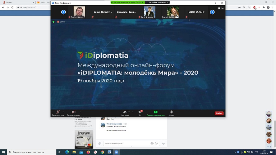 19 ноября студенты направления подготовки «Социальная работа», профиль «Управление и предпринимательство в социальной работе» стали участниками Международного онлайн-форума «iDIPLOMATIA: молодежь Мира – 2020». Целью данного мероприятия является развитие межрегионального и международного взаимодействия молодежи по вопросам безопасности, молодежной политики и использования современных медиатехнологий.
