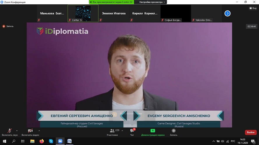 «В рамках международного онлайн-форума «IDIPLOMATIA: молодежь Мира – 2020» мне удалось послушать выступление геймдизайнера Евгения Сергеевича Анищенко. На основе прослушанного материала я могу сделать вывод, что видеоигры активно проникают в нашу повседневную жизнь. Благодаря интерактивности игры дают возможность прочувствовать на себе уникальный опыт, чего нет в других видах искусствах. Игры имеют безграничный потенциал».