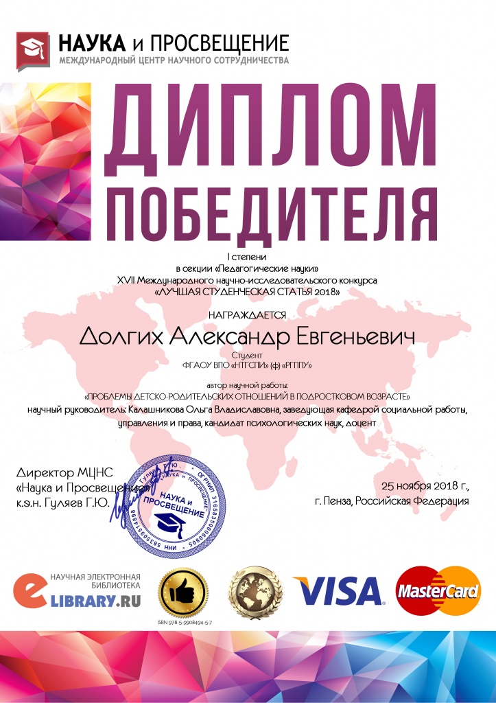 Студенты выпускного курса социально-гуманитарного факультета направление подготовки «социальная работа» (Байн А., Волкова Д., Долгих А., Кожанов Ю., Миронова Н., Фатыкова В., Чезганова В., Уткина К., руководитель – Калашникова О. В.) и «управление персоналом» (Богданов Е., руководитель – Белоусова И. В.) приняли участие в Международном научно-исследовательском конкурсе «Лучшая студенческая статья – 2018» (секции «Педагогические науки» и «Социологические науки») и стали победителями!