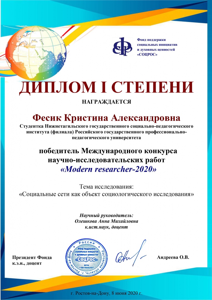 Кристина Фесик (2 курс, СГФ) также получила диплом I степени за научную статью в области социологии – «Социальные сети как объект социологического исследования». Её научный руководитель – канд. ист. наук, доцент А. М. Олешкова.