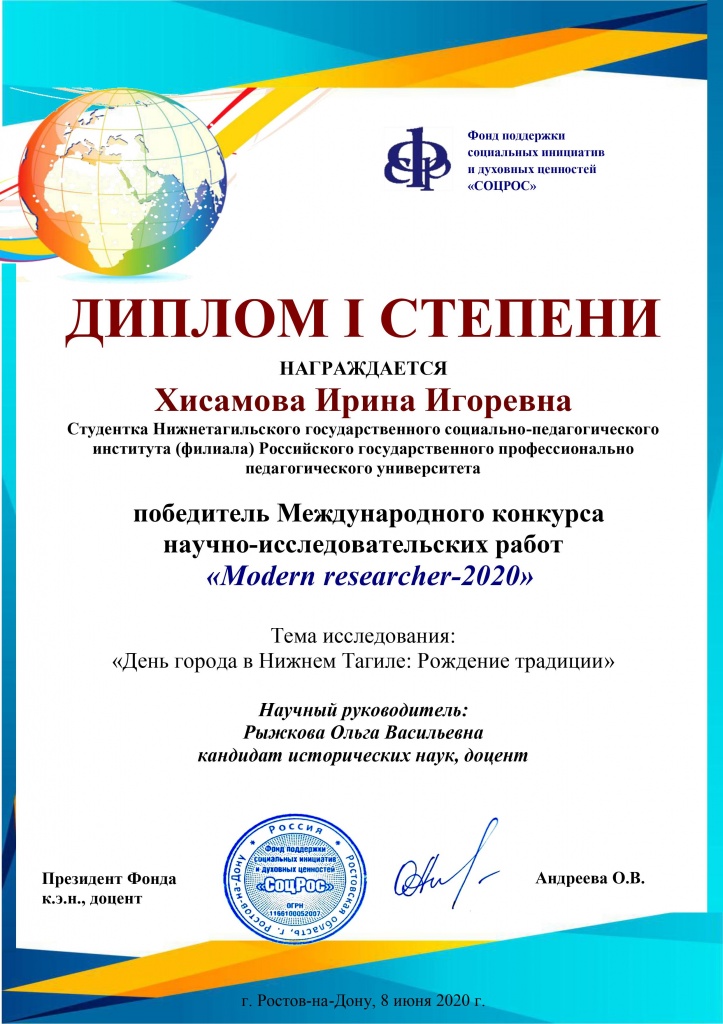 Ирина Хисамова (2 курс, СГФ) под руководством канд. ист. наук, доцента О. В. Рыжковой написала работу по истории Нижнего Тагила «День города в Нижнем Тагиле: Рождение традиции» и заняла I место среди студентов бакалавриата.