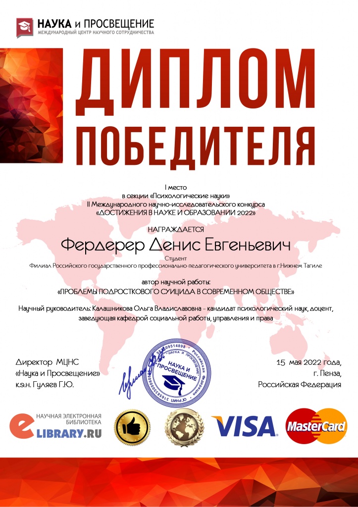 Студенты 3-го курса социально-гуманитарного факультета направления подготовки «Социальная работа», профиль «Управление и предпринимательство в социальной сфере» И. Ю. Ведерников, В. М. Осипов, Д. Е. Фердерер, А. А. Шмакова под руководством доцентов кафедры социальной работы, управления и права И. Ж. Калашниковым и О. В. Калашниковой стали победителями Международного научно-исследовательского конкурса «Достижения вузовской науки – 2022», который проводил Международный центр научного сотрудничества «Наука и просвещение» в г. Пенза.